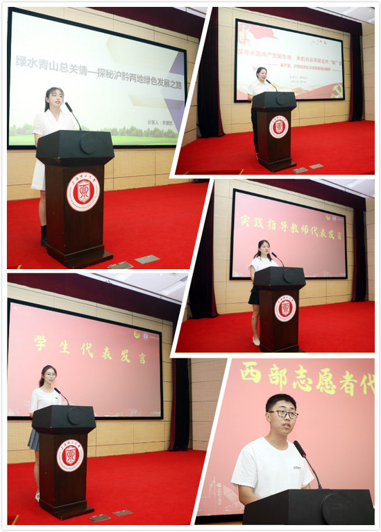 环建学院李媛媛和马克思主义学院殷洁如同学作为知行杯获奖代表分享经验。版艺学院方智果和中英学院梅佳蓉分别代表实践指导教师和学生作发言。外语学院戴嘉驹代表西部志愿者发表出征感言。