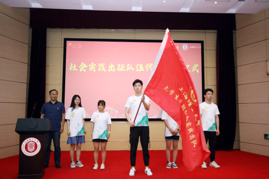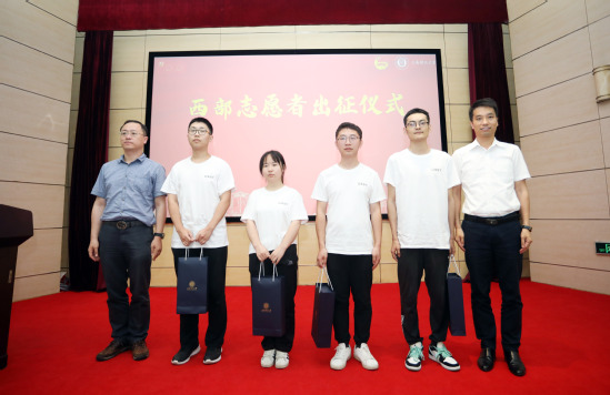 彭宗祥向暑期社会实践团队代表授旗。谢锡浩、孙立为西部志愿者发放学校纪念品。
