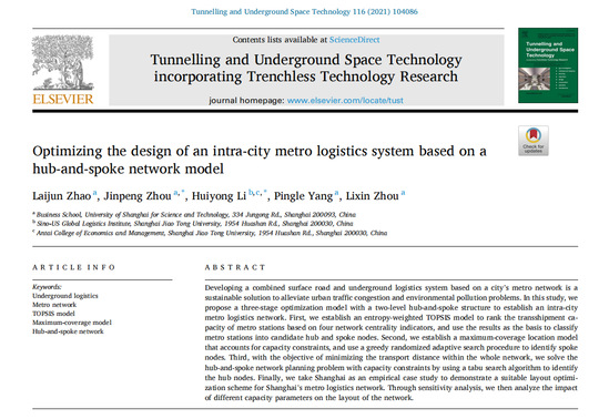 近日,由我校管理学院赵来军教授与硕士生周金鹏等共同完成的论文《基于轴辐式网络模型的城市地铁物流系统优化设计》(Optimizing the design of an intra-city metro logistics system based on a hub-and-spokenetwork model)在国际重要期刊《隧道与地下空间技术》(Tunnelling and Underground Space Technology)上发表。