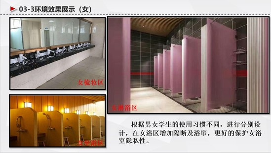 “追求校园美好生活是我们永恒的主题,师生的期许就是我们努力的方向,我们希望通过改造,把北区的浴室打造成为‘网红浴室’,切实提升师生的幸福感和获得感!”后勤管理处处长谢金平介绍道。此外,学校还将继续推进“洗浴进公寓”工程,在暑期完成对北区第七宿舍的改造,实现“女生寝室不出楼门即可洗浴”的全覆盖。