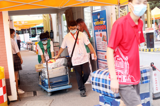 “同学你好,请问十二宿舍怎么走?”“学弟好,你先乘坐校园短驳车吧,下车后会有志愿者带你过去。”学校门口,身着各种颜色服装的志愿者们各司其职、相互配合,解答新生们的疑问,负责新生行李搬运“最后一公里”工作。