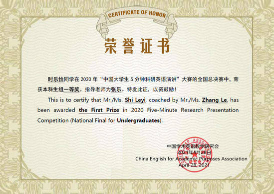 我校大学英语竞赛团队从去年7月开始备赛,在全校范围内遴选人才,并在“上海理工大学泛在学习平台”上遴选参赛作品。学术英语授课教师、公共英语教研中心张乐副教授对优秀作品开展进一步的精心指导和打磨。最终,来自出版印刷与艺术设计学院的19级学生时乐怡同学荣获本科生组全国一等奖,另有三名同学获得二等奖、三等奖。