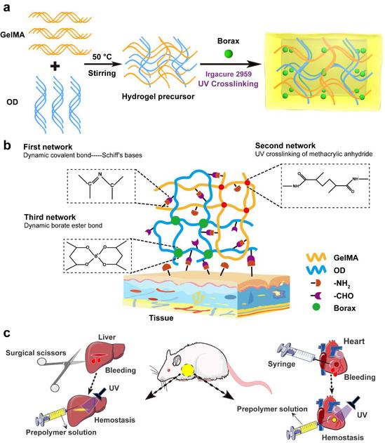 急性大出血和相关的伤口感染是导致人员死亡的重要原因之一。脏器内动脉破裂常伴有无法控制的大出血,伤口难以自愈等特征。水凝胶可以在伤口界面与血液形成一个保护屏障,紧密粘附不平整的创面,构建物理屏障,有效预防炎症。与此同时,它还能促进新血管和组织的形成,促进上皮细胞生长和伤口愈合。本研究设计了一种GelMA/OD/Borax三重网络水凝胶。这一水凝胶具有较高的组织粘附能力、抗菌能力和抗拉抗压能力,有望应用于小动脉以及心脏、肝脏等内脏的止血领域。