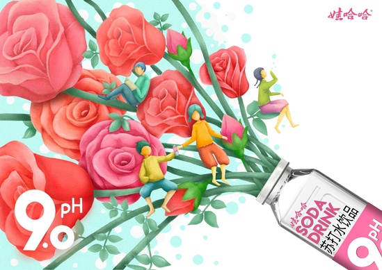 作品介绍:此玫瑰味苏打水广告设计从口味出发,瓶子里慢慢长出的玫瑰花来体现健康,同时也表达了口味,吹泡泡的人、看书的人、递水的人表现舒缓的状态,整体色调体现浪漫平稳的心情。