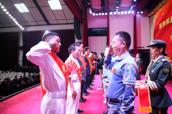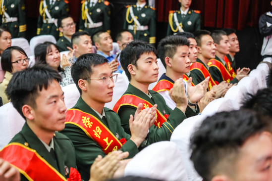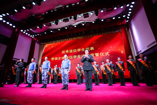 由3位逐梦深蓝讲师团成员和2位往届优秀退伍大学生代表开始,30名退伍大学生依次以洪亮的声音报出他们原部队番号:“中国人民解放军92132部队张楠!(海军青岛舰原副舰长)”“中国人民解放军91091部队袁兴池!”“中国人民解放军驻香港部队简涛!”“武警海警总队浙江支队董向峰!”……声浪震天,回荡在礼堂上空,也激荡在每一位师生心中。