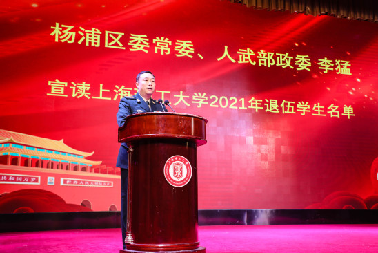 杨浦区委常委、人武部政委李猛宣读了上海理工大学2021年退伍大学生名单,应邀从山东青岛赶来参加主题活动的逐梦深蓝讲师团成员和我校教师代表共同为2021年退伍大学生佩戴绶带。