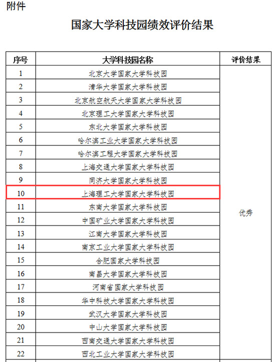 10月29日,科技部、教育部联合发布《关于发布国家大学科技园绩效评价结果的通知》国科发区〔2021〕293号。按照《关于开展国家大学科技园绩效评价工作的通知》(国科办区〔2020〕76号)部署,科技部会同教育部委托第三方专业评估机构对全国115家国家大学科技园进行了绩效评价,并将结果予以公布,上海理工大学科技园蝉联国家大学科技园绩效评价“优秀”。