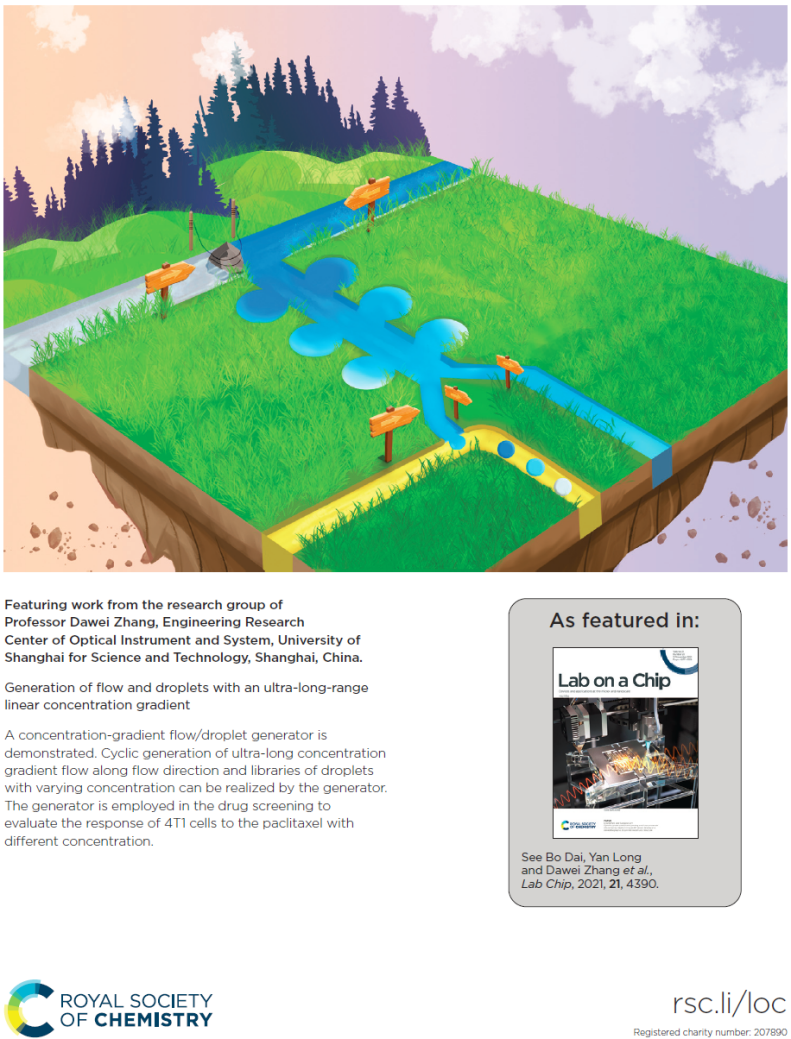 上海理工大学未来光学国际实验室庄松林院士、张大伟教授带领的超精密光学制造团队与加拿大曼尼托巴大学Francis Lin教授、复旦大学付永锋副教授、中国科学院深圳先进技术研究院巫建东副研究员、长海医院郭世伟教授合作,创新地提出了“超长线性浓度梯度生成的微流控技术”。论文作为封面论文在国际一流期刊《芯片实验室(Lab on a chip)》发表。12月5日,RSC英国皇家化学会官方微信号重点推介了这项成果。上海理工大学戴博教授、硕士研究生龙严同学和中国科学院深圳先进技术研究院巫建东副研究员为第一作者,张大伟教授、加拿大曼尼托巴大学Francis Lin教授和复旦大学付永锋副教授为通讯作者。