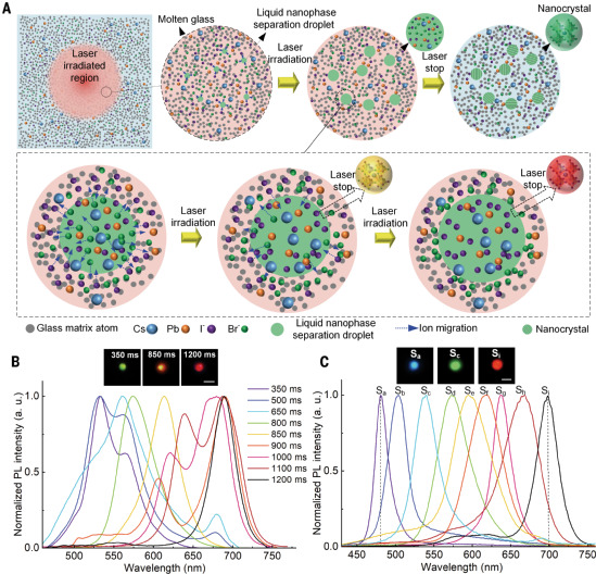 研究成果以《玻璃中稳定的钙钛矿纳米晶体三维直写》(Three-dimensional direct lithography of stable perovskite nanocrystals in glass)为题发表在《科学》正刊,论文共同第一作者为浙大光电学院博士生孙轲、之江实验室PI谭德志、上海理工大学副教授方心远。