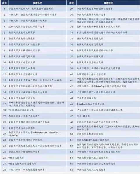 中国高等教育学会自2017年发布第一轮全国普通高校大学生竞赛排行榜以来,已连续发布六轮榜单(每轮榜单取近五年竞赛成绩)。根据相关管理原则,本次全国性56项大学生重大竞赛纳入榜单(见配图)。