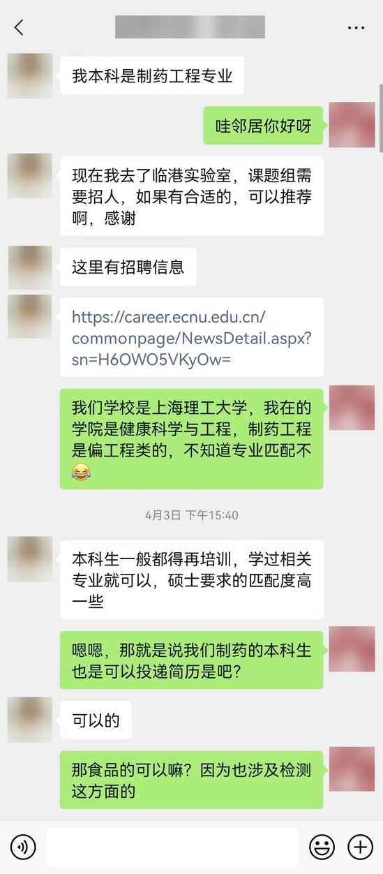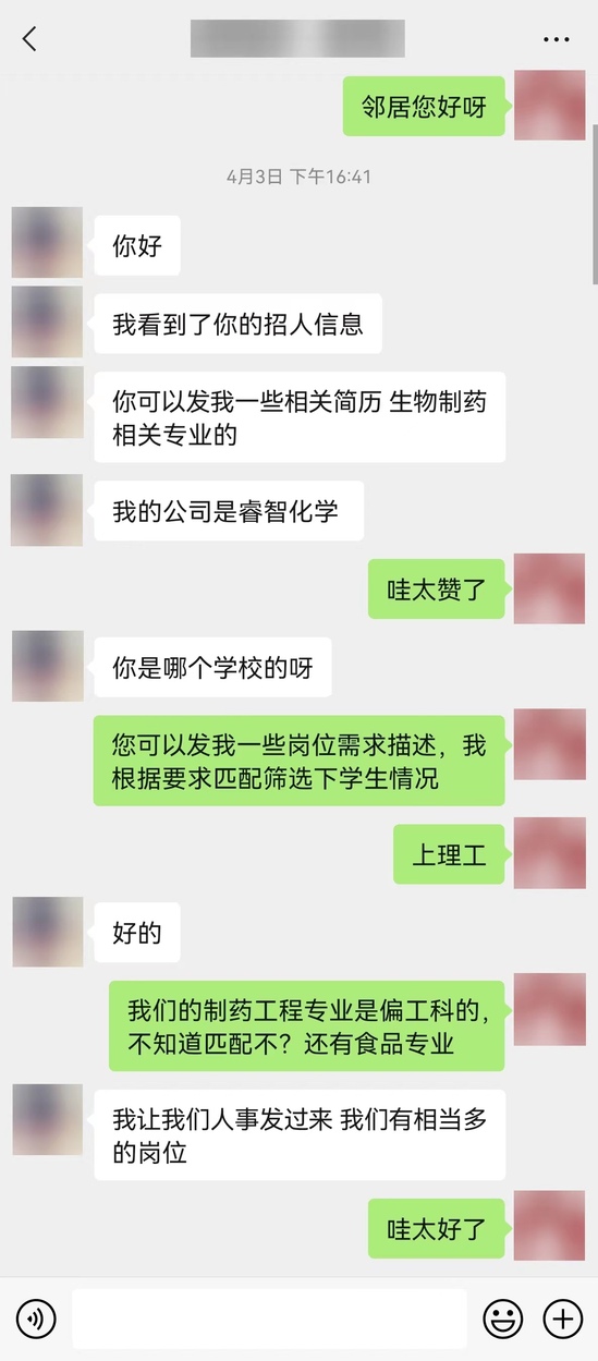 此次向朱旭抛出“橄榄枝”的另一位邻居叫徐白。平时与朱旭平时只是“点头之交”,看到群内的消息后,就职于中科院上海药物所药物安全评价研究中心的她,立即加朱旭为好友,在确认了毕业生的教育背景等基本情况后,反馈给中心的人力资源部门。短短几天时间,就促成了后续的线上面试等招聘流程。