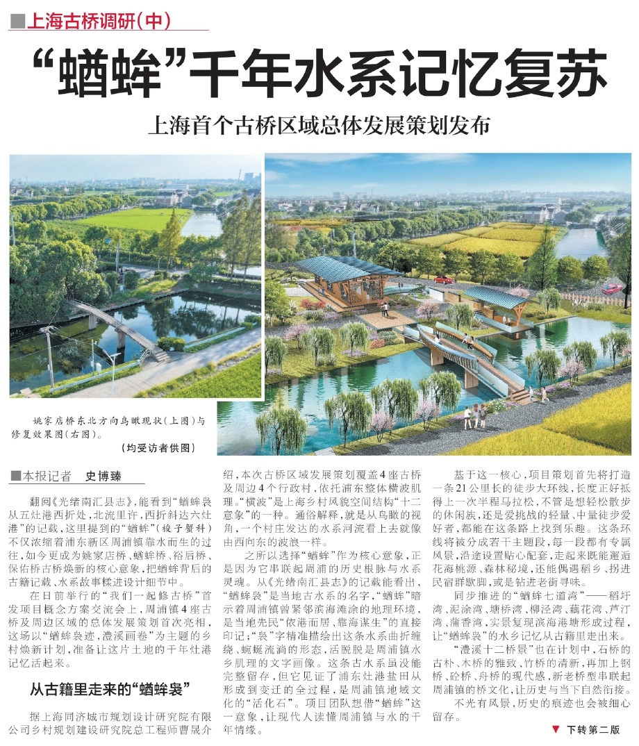 翻阅《光绪南汇县志》,能看到“蝤蛑袅从五灶港西折处,北流里许,西折斜达六灶港”的记载,这里提到的“蝤蛑”(梭子蟹科)不仅浓缩着浦东新区周浦镇靠水而生的过往,如今更成为姚家店桥、蝤蛑桥、裕后桥、保佑桥古桥焕新的核心意象,把蝤蛑背后的古籍记载、水系故事糅进设计细节中。