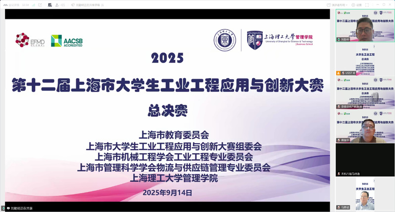 9月14日,2025年第十二届上海市大学生工业工程应用与创新大赛总决赛成功举办。本次大赛由上海市教委主办,上海市机械工程学会、上海市机械工程学会工业工程专业委员会、上海市管理科学学会物流与供应链管理专业委员会、上海理工大学管理学院联合承办,以线上会议形式召开,为进一步推动工业工程专业深化产教融合、强化协同育人提供平台支撑。教育部工业工程类专业教指委副主任、上海市机械工程学会工业工程专业委员会主任、上海交通大学特聘教授江志斌,上海理工大学管理学院党委书记马静波,上海市大学生工业工程应用与创新大赛主席、上海理工大学教授叶春明出席并致辞。大赛由管理学院工业与系统工程系主任刘勤明主持。