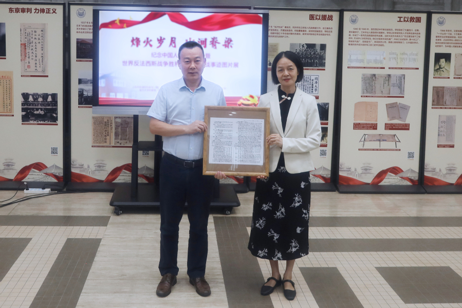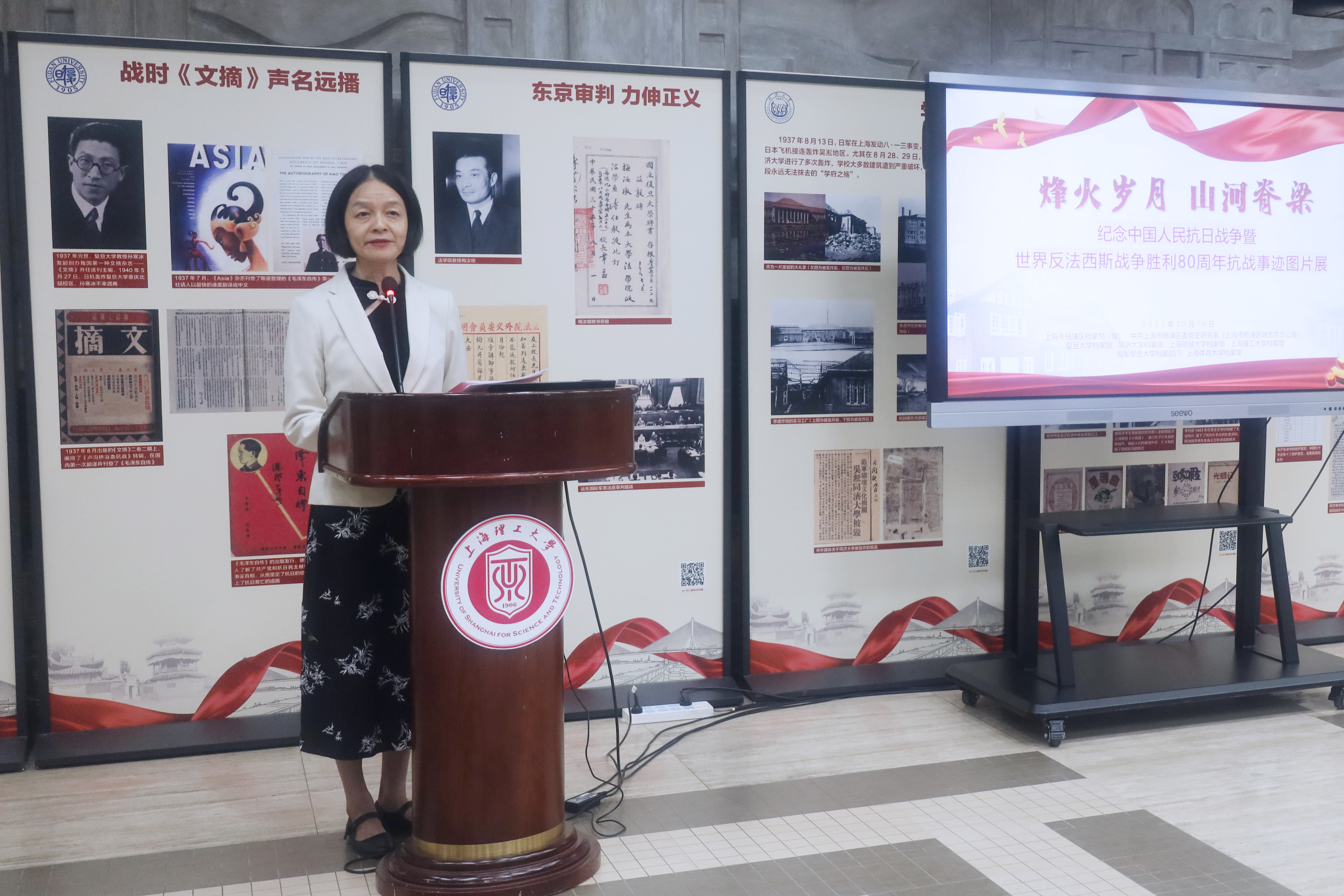10月16日,上海理工大学第三届档案校史文化月系列活动之“烽火岁月 山河脊梁”纪念中国人民抗日战争暨世界反法西斯战争胜利80周年抗战事迹图片展上海理工大学巡展开幕式与“解码红色记忆:档案利用与传播”专家研讨会共同举办。上海理工大学副校长蔡永莲、杨浦区委党史研究室(区方志办)主任黄伟一、杨浦区档案局(馆)长史英俊、杨浦区档案馆副馆长彭绍钧、上海财经大学档案馆(校史馆)/博物馆馆长喻世红、复旦大学校史研究室主任钱益民、同济大学档案馆副馆长王晶晶、上海体育大学档案馆(校史馆)副馆长龚燕萍、海军军医大学教研保障中心档案室副主任陈颖、上海理工大学校团委副书记杨阳出席活动,档案馆全体工作人员和学生志愿讲解员代表参加。活动由档案馆馆长孔娜主持。