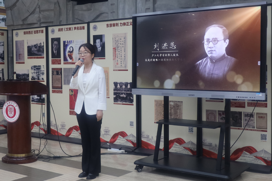 随后,档案馆肖琳琳以眼镜、书信为线索,深情讲述了刘湛恩长校沪江推动中国化校政改革,抗战爆发后坚定抗日不惧日伪威胁,最终遭日伪特务暗杀以身殉国的爱国事迹,在场师生无不动容。