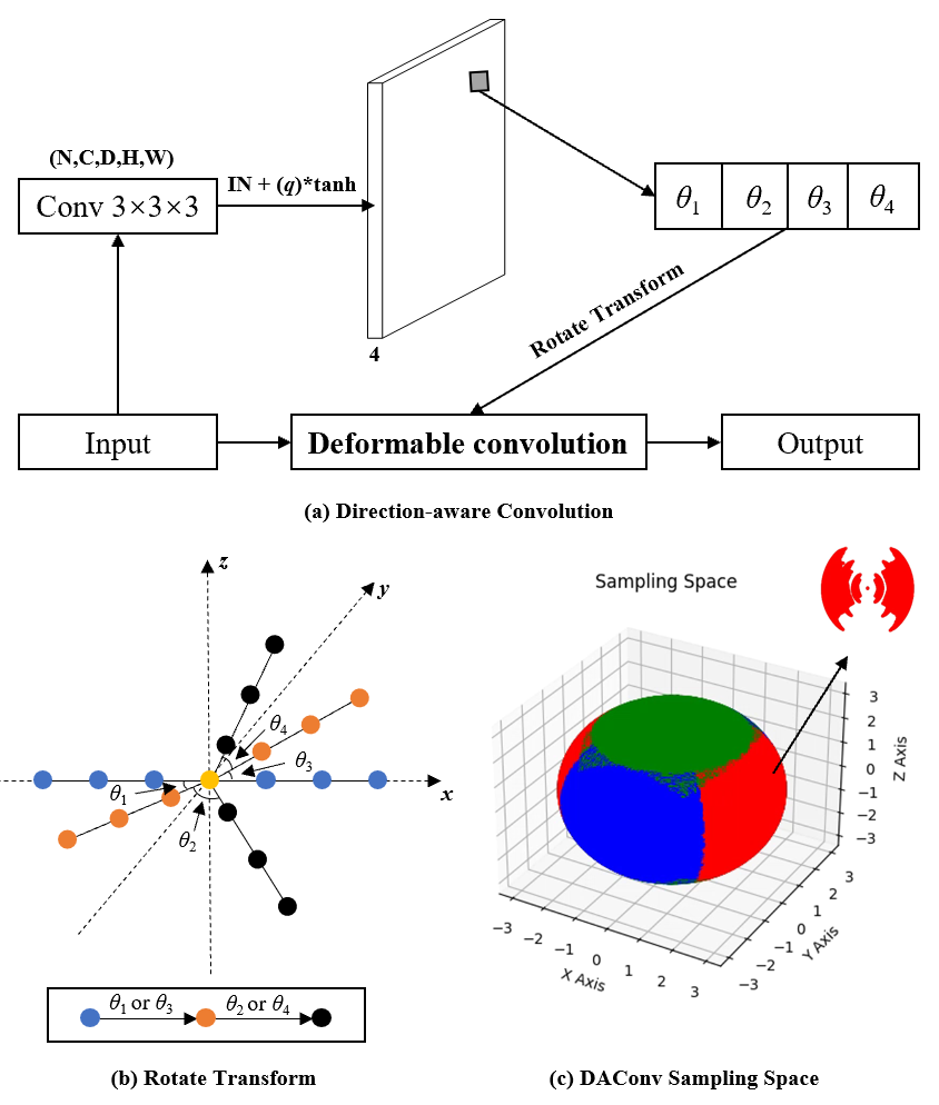为了解决该问题,研究团队创新性提出了“方向感知卷积”的概念,该创新的理念始于可变形卷积和气道独特的树形结构,通过旋转变换和位置偏移,改变传统卷积核的形状,使得卷积核的形状适应气道细长的结构,促使气道提取网络获得更多有效的气道管状特征,从特征增强的角度解决气道漏检和过分割的传统问题。该成果在最大的肺部气道分割数据集ATM22和最大的纤维化肺部气道分割数据集AIIB23取得了最优的平均性能指标,分别为94.95%和89.70%。在ATM22数据集中,气道树长和分支检测率达到了95.34%和93.39%,在AIIB23数据集中,实现了95.50%和95.76%的气道分割精度和泄露控制率,展现了世界领先的气道提取连续性能和准确性能。