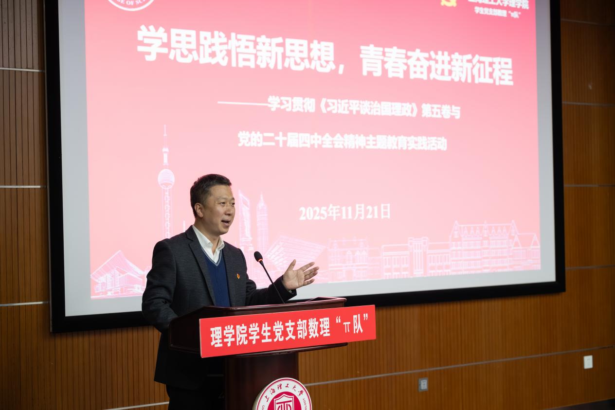 为深入学习贯彻党的二十届四中全会精神,深刻领会习近平总书记在纪念陈云同志诞辰120周年座谈会上的重要讲话精神,传承陈云同志“不唯上、不唯书、只唯实,交换、比较、反复”的十五字诀,11月21日,上海理工大学理学院研究生应用数学党支部与研究生应用数学第二党支部以“数理π队”党建活动品牌为依托,开展“学思践悟新思想,青春奋进新征程”主题教育实践活动。理学院党委书记孟宝全、学生工作部副部长刘伟、理学院党委副书记李晓庆与全院研究生党员齐聚一堂,共赴这场“数理+红色”的思想盛宴。