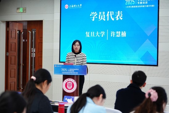 结业仪式上,来自复旦大学的许佳慧老师作为学员代表上台发言,以切身经历分享培训感悟。“作为一名长期陪伴人文基础学生成长的辅导员,我常思考:如何让学生守住专业初心,又能在就业市场找准定位?如何将他们‘读史明辨’的思维、‘文字表达’的优势转化为职场核心竞争力?”她坦言,三天的培训如“及时雨”,为她打开了破解困惑的大门。她代表全体学员衷心感谢上海理工大学辅导员培训研修基地的精心组织、专家老师的方法传授,以及同仁们的交流互助。“结业不是终点,而是新的起点。回到岗位后,我们将把‘精准指导’理念融入日常,用更专业的能力、更务实的作风,为学生职业发展护航,助力更多毕业生将个人成长融入城市未来与强国建设!”