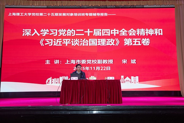 上海市委党校马克思主义学院副院长宋斌副教授以“深入学习党的二十届四中全会精神和《习近平谈治国理政》第五卷”为题,从时代背景、核心内容、精神实质三个方面系统解读了新时代坚持和发展中国特色社会主义的一系列重大理论和实践问题,深刻阐释了党中央治国理政的新理念新思想新战略;勉励发展对象要在成长道路上加强学习以坚定理想信念、在实践中践行以人民为中心的价值取向、以高度的政治自觉不断增强“四个意识”、坚定“四个自信”、做到“两个维护”,真正做到学思用贯通、知信行统一,以实际行动不断向党组织靠拢。