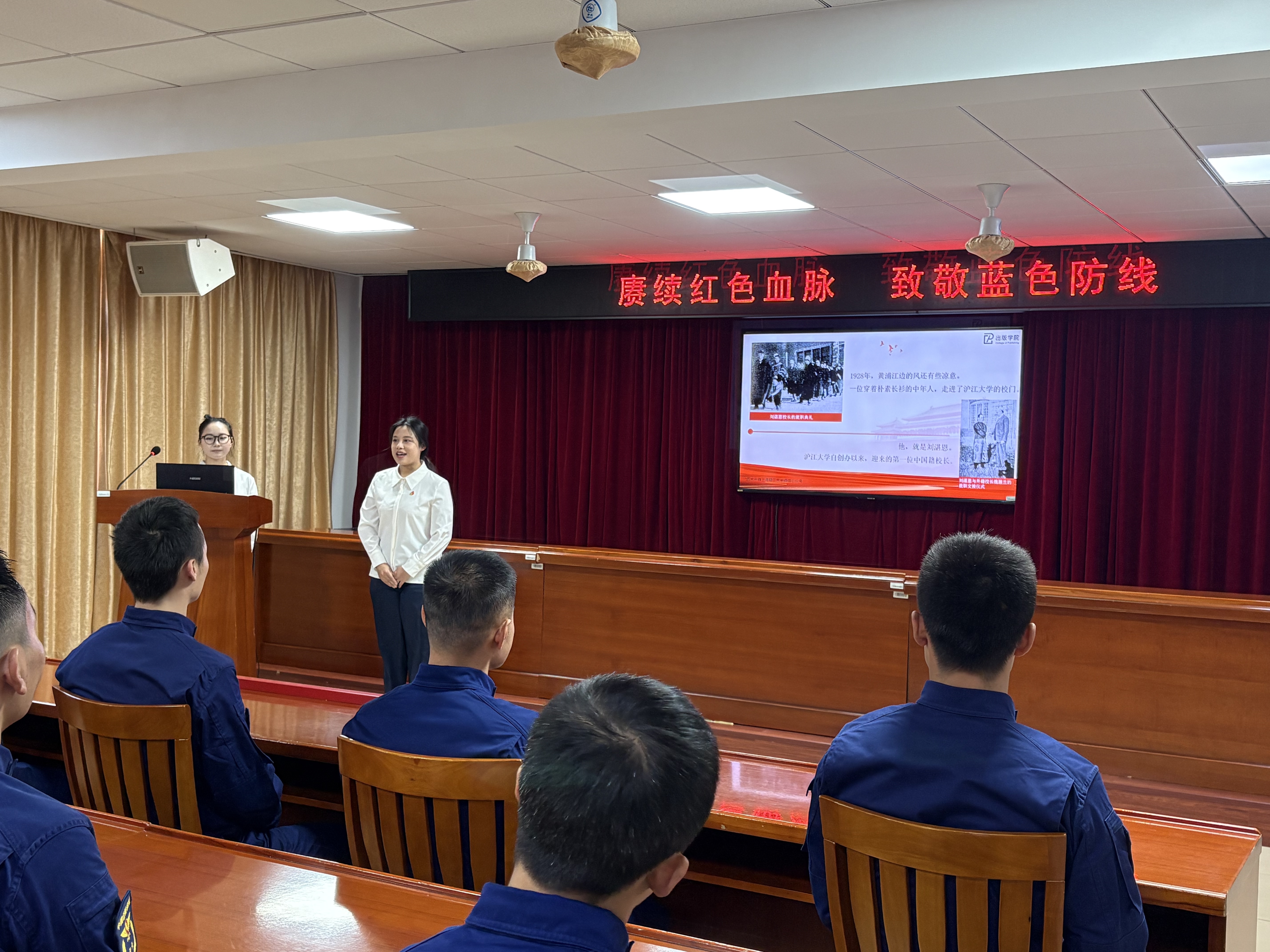 随后,在宣讲环节中,研究生党员汤茗迪和入党积极分子康馨予以《沪江长歌:刘湛恩校长的爱国丰碑》为题,深情讲述了沪江大学老校长刘湛恩先生从教育救国到以身殉国的感人事迹。研究生党员周佳以《解码军旅精神:出版人的力量与传承》为题,从出版学院退伍大学生士兵梁靖的经历切入,分享了军营熔炉所锻造的忠诚、担当与坚韧品格,讲述了出版战线“文化战士”们传承军旅精神、筑造文化长城的动人故事,呼吁新时代出版人承先辈之志,为繁荣社会主义文化贡献智慧与力量。宣讲团情深意切、真挚动人,在讲解中将红色的历史血脉与蓝色的忠诚防线有机串联,赢得了现场阵阵掌声。