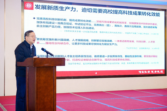 在报告中,朱新远详细介绍了学校近年来围绕国家战略需求在推动科技成果转化机制改革、完善产教融合创新体系方面的探索和成效。他重点分享了学校在深化人事制度改革、搭建校企合作生态链、建设高水平大学科技园、探索职务科技成果赋权改革试点、引入“先用后转+保险”等科技金融服务机制等方面的创新举措和实践经验,全面展现了上海理工大学服务产业、促进科技成果高效转化的有益尝试和成功范例。
