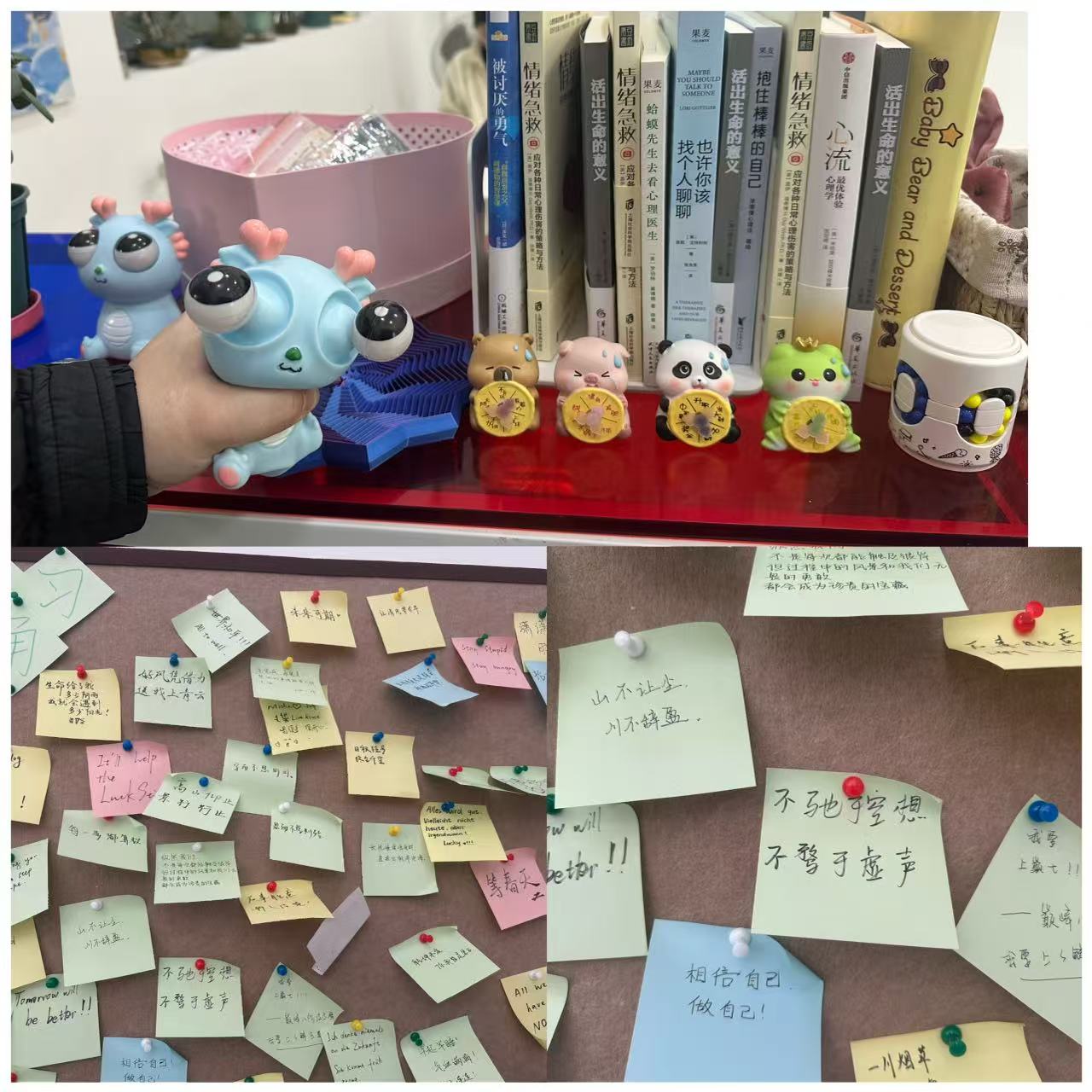 “学习漂流瓶”和“心灵驿站”则为同学们提供了知识共享与情感交流的平台。同学们在此分享学习心得、推荐好书、记录感悟,并通过减压玩具与书籍阅读放松身心,营造出安静温馨、互助成长的宿舍文化角落。