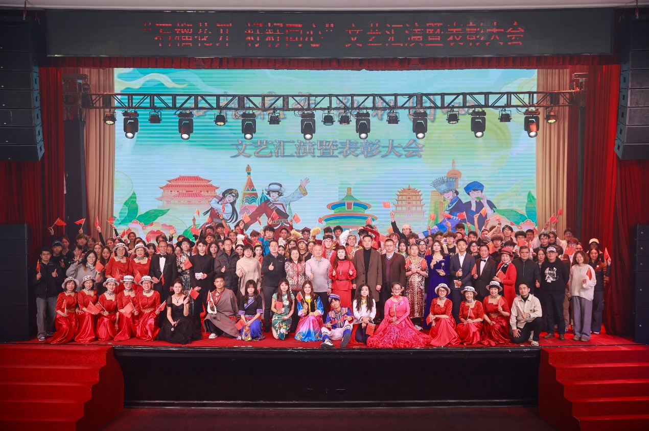 霓裳共舞话团圆,民族团结永相传。在民族服饰走秀《霓裳共舞》中,56个民族的特色服饰依次惊艳亮相,模特们步履从容、姿态优雅,将各民族服饰的精美工艺与文化底蕴展现得淋漓尽致,生动诠释了中华各民族“美美与共、和合共生”的深厚内涵。在全体演职人员与现场嘉宾合唱《歌唱祖国》的嘹亮歌声中,本次活动圆满落下帷幕。
