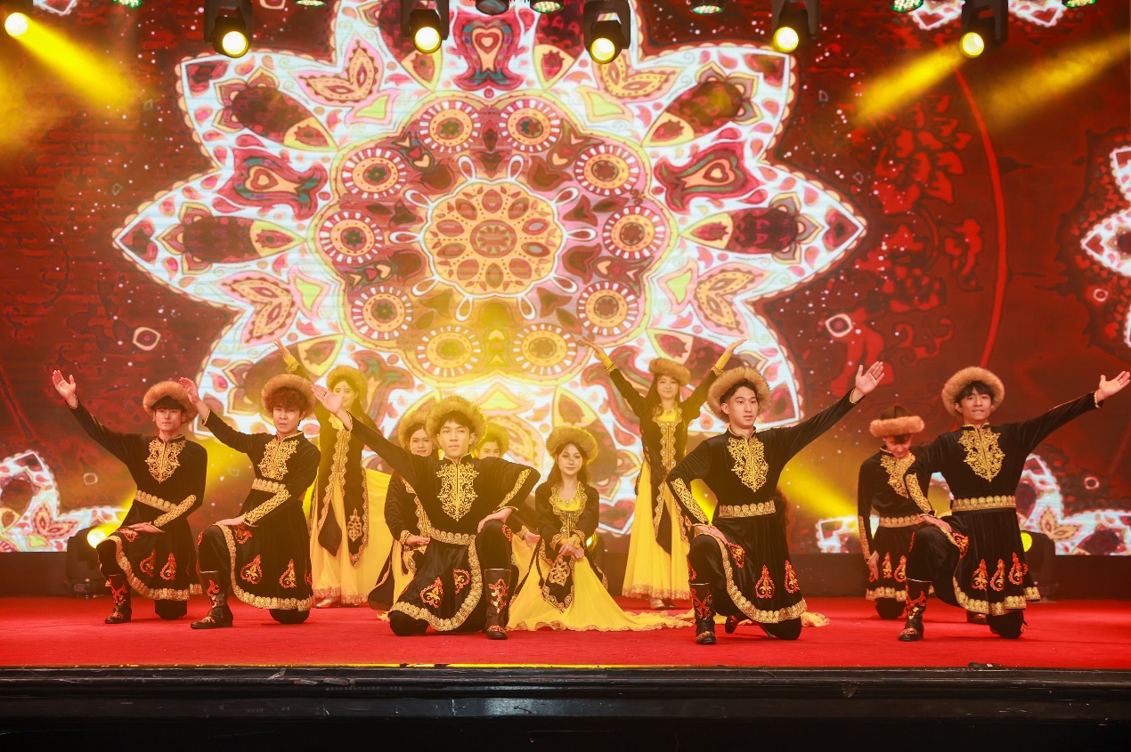 民族文艺绽芳华,文化交融谱新篇。文艺汇演环节精彩不断,成为展示民族文化多样性的生动舞台。维吾尔族独舞《乃吾茹孜》韵味悠长,藏族传统锅庄舞蹈充满灵动韵味,朗诵《青春中国》情感激昂,经典情歌《Tum hi ho》、现代舞《Whiplash》、合唱歌曲《莫斯科有我的爱》等节目各具风采。传统与现代交织、民族与世界交融,为观众呈现了一场沉浸式文化盛宴。穿插其间的互动抽奖环节更添欢声笑语,让团结的氛围愈发浓厚。