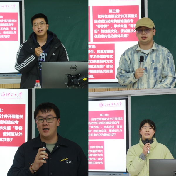 在专题研讨环节中,与会骨干划分为五个小组,分别聚焦于“如何智慧拒绝并转化作弊请求”“如何识别与化解侥幸心理并提供学业支持”“如何设计行动以建设‘零作弊、零容忍’的班级诚信文化”等五个议题展开深度研讨。现场讨论气氛十分热烈,不同视角、不同思想不断碰撞,各小组成员在辅导员的引导下,结合身边实际,剖析问题根源、模拟应对场景、共商可行方案。随后,各小组代表展示小组研讨成果,从“友善而坚定”的拒绝话术到“学业帮扶小组”的运作设想,从诚信承诺书的想法到系统化劝阻不诚信行为的分级干预流程,小组代表们汇报了一系列兼具思想性与操作性的策略建议,这生动展现了学生骨干们从“知”到“行”的思考跃迁与实践智慧。