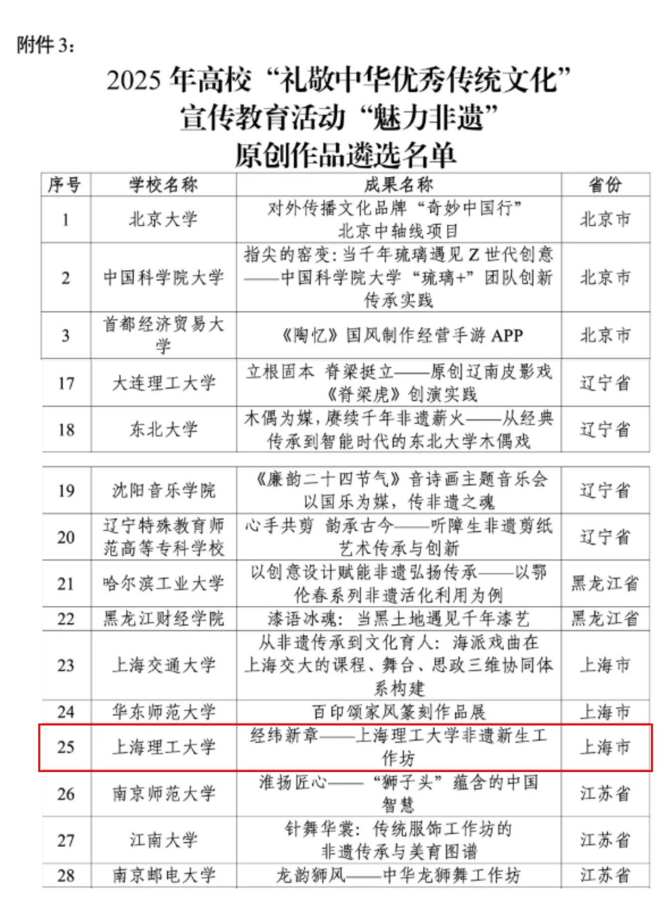 2025年高校"礼敬中华优秀传统文化"宣传教育活动"魅力非遗"原创作品遴选名单