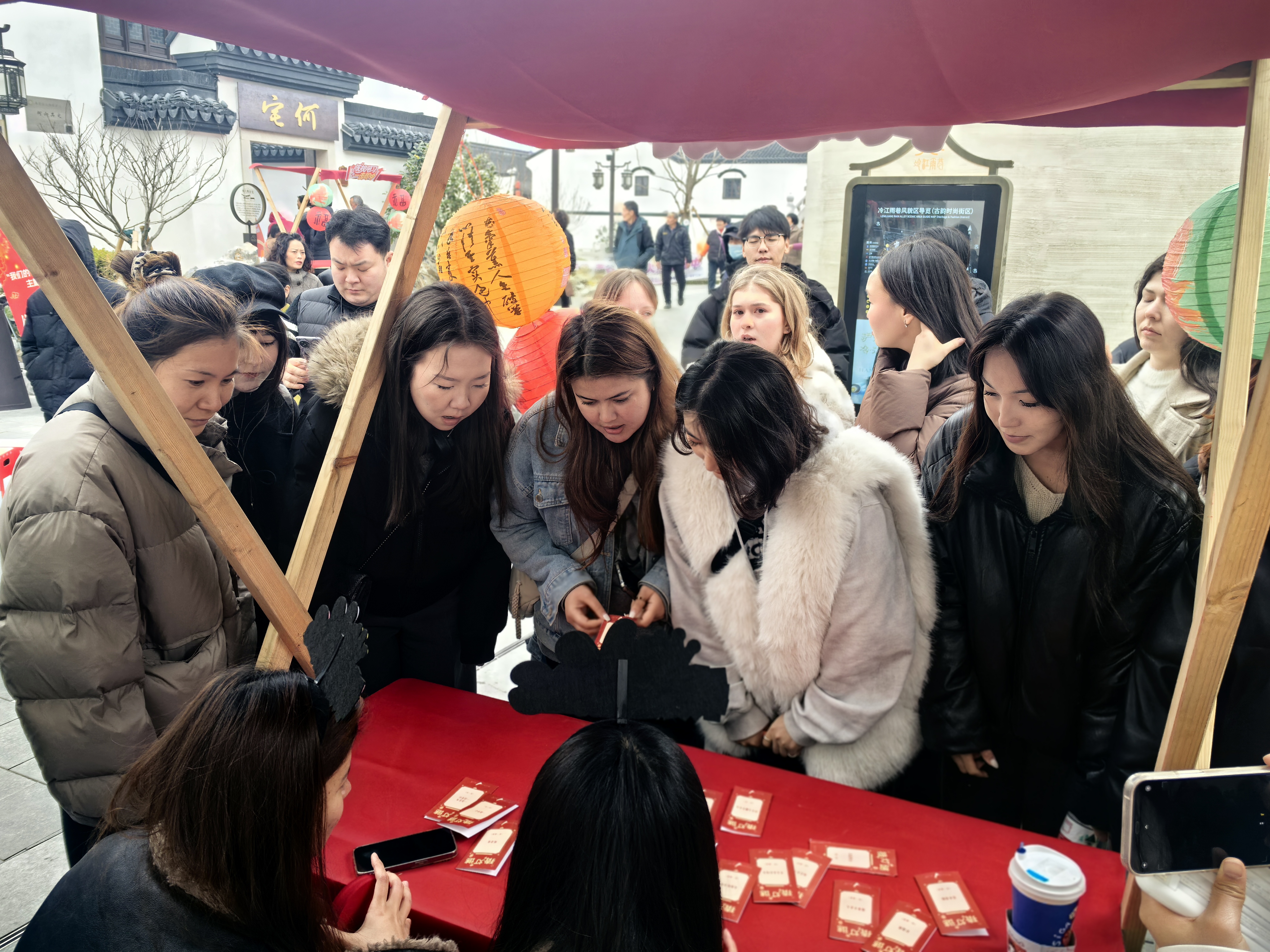 在热闹的“花米文明食光”集市,国际学生们开启了一场集民俗体验与市集文化于一体的探索之旅。同学们手持集章卡片,穿梭于各个特色摊位之间,完成趣味打卡集章,感受节日氛围。学生们通过市集的市场化运作模式,初步领略了庄行镇将本土文化资源转化为商业价值的创新思路。