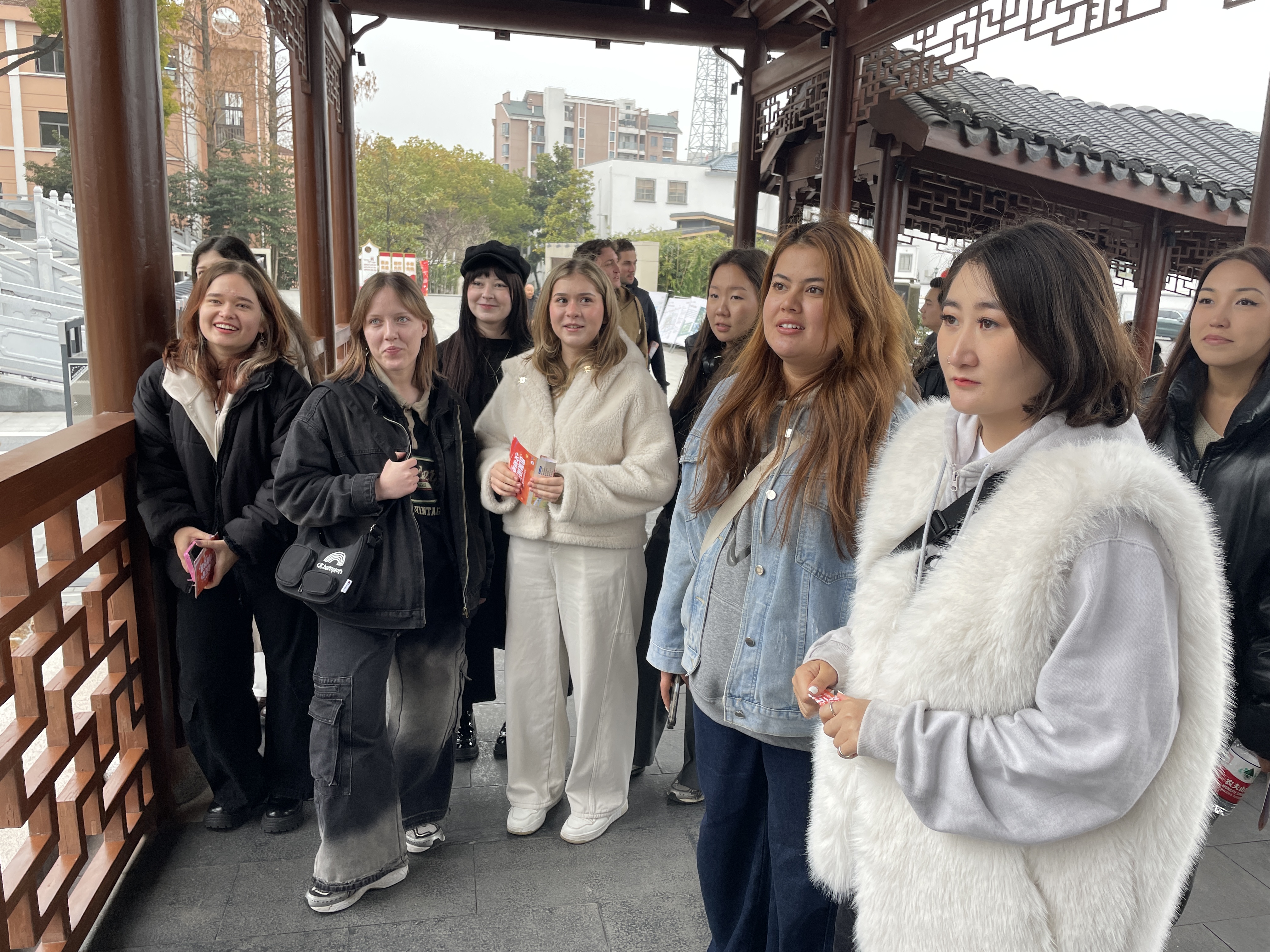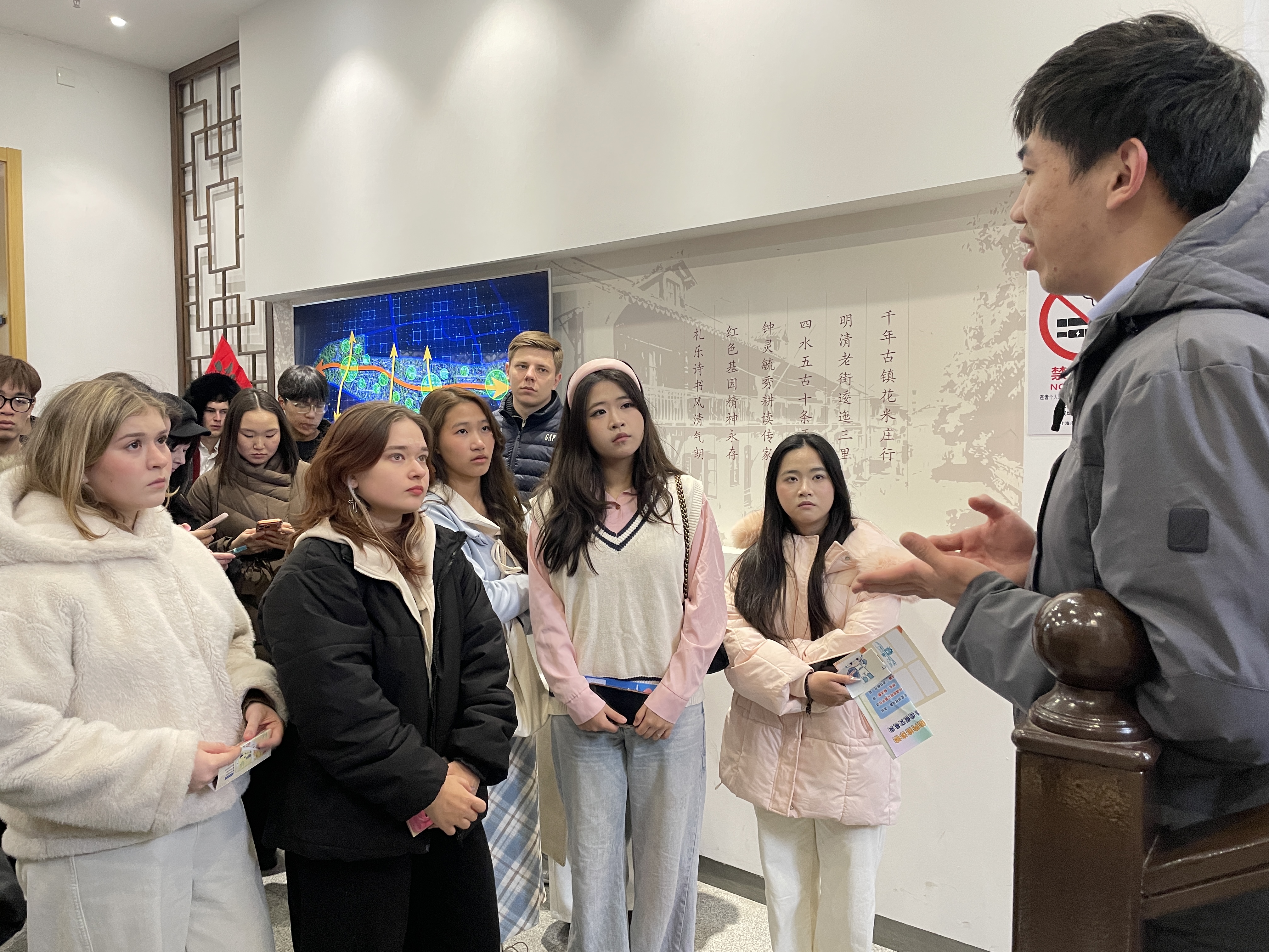 沿着青石板路,同学们参观了焕然一新的庄行镇古街。在讲解员的带领下,他们深入了解了庄行镇的历史文脉以及古镇在保护中开发、在传承中创新的发展历程。从传统建筑到现代文创空间的转变,让国际学生们对“乡村振兴”有了更具象的认知,也为他们理解当地的创业土壤提供了文化视角。