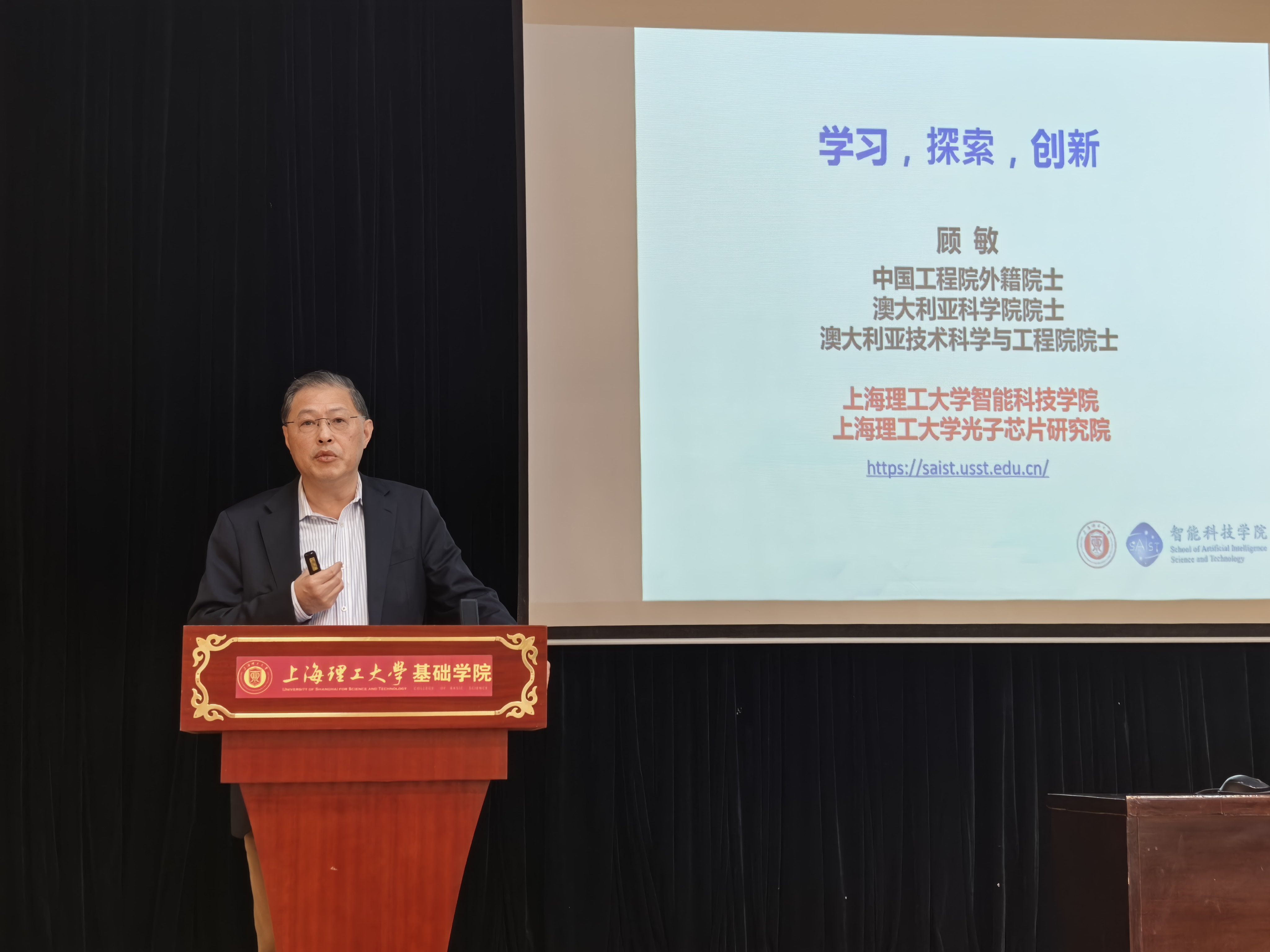 讲座伊始,顾敏院士引述了沪江大学梅佩礼先生的名言来勉励学生们,身处这所浸润着厚重文脉的校园,更当赓续百年荣光,胸怀寰宇,追求属于自己的广阔世界与光荣梦想。顾院士结合自身成长经历,并以诺贝尔物理学奖得主泽尔尼克为起点,系统梳理了光学领域多位诺奖获得者的突破性成果,为在场学子勾勒出一幅立体而恢弘的光学创新图谱,引出其团队在光学芯片领域的前沿突破与未来愿景。顾敏院士长期深耕三维光学成像、纳米光子学及光子芯片等前沿方向,学术成就卓著。讲座中,他以科研生涯中的关键节点为脉络,强调真正的创新源于在已知边界之外的持续探索,他向学生们展示了光子芯片研究院的最新研究进展,并勉励大家,科研之路无捷径,唯有保持好奇心与韧性,方能在日新月异的科技浪潮中实现从0到1的突破。