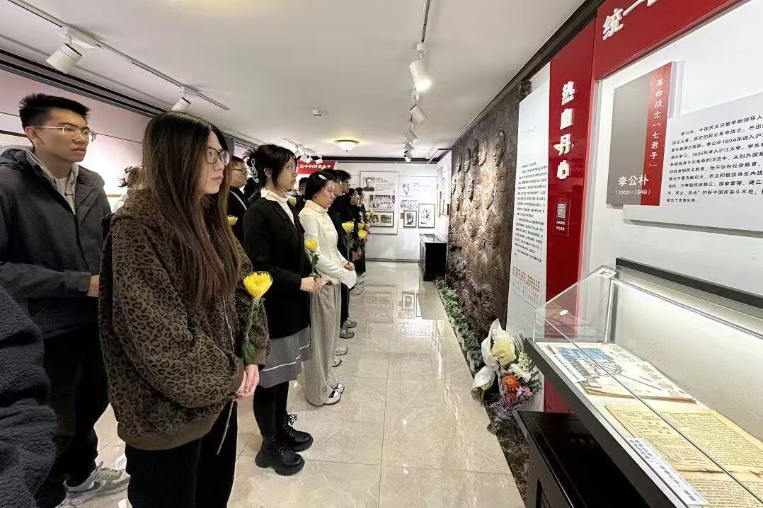 清明时节,细雨纷纷。杨浦区委宣传部、区文明办及长白新村街道办事处相关负责人,上海理工大学相关职能部处负责人及师生代表等来到刘湛恩烈士故居红色文化主题馆,共同参加活动。在这片烈士墙上,镌刻着校史上15位革命先烈的光辉形象,刘湛恩、李公朴等爱国志士的事迹震撼人心、催人奋进。全体人员肃立静立,面向烈士墙默哀,表达深切哀思与崇高敬意。默哀毕,师生代表手持菊花,缓步上前敬献,以朴素而庄重的仪式致敬革命先烈、感悟初心使命、坚定理想信念。