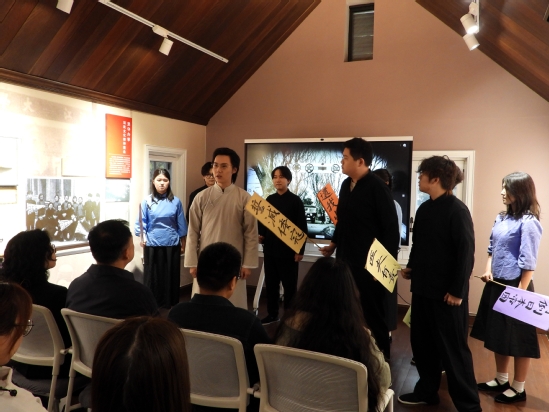 校大学生艺术团在故居带来大师剧《刘湛恩》的沉浸式演出。同学们以生动表演还原了1937年淞沪会战期间,沪江大学首任华人校长刘湛恩劝导学生“读书不忘救国,救国不忘读书”的历史场景,以深情演绎诠释理性爱国、实干担当的深刻内涵。在场师生被剧情深深打动,深刻体会到老校长在民族危亡之际坚守教育阵地、培养抗日救亡青年骨干的赤诚之心。舞台上,老校长的铿锵话语穿越时空,振聋发聩;舞台下,刘湛恩的扮演者——2025级电子信息类田诗瑜同学感慨道:“很荣幸能扮演这一灵魂角色,让我能在每一次排练和演出中沉浸式感受老校长教育救国的精神。未来我会将个人理想融入国家发展,以青春担当践行时代使命。”