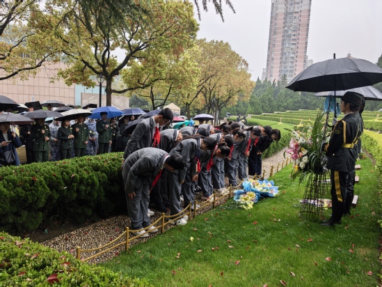 追思先贤的脚步跨出校园,踏进了庄严肃穆的龙华烈士陵园。“尚理军旅团”学生代表身着笔挺礼宾服,步伐铿锵,将花篮庄严敬献于刘湛恩烈士墓前。刘湛恩烈士亲属,学校校友处、校团委和师生代表,学校附属中学、附属储能中学、附属实验初级中学、附属小学、附属幼稚园等师生代表依次敬献捧花,俯身整理挽带。附属幼稚园薛仲瑶小朋友用稚嫩的声音说道:“我们把黄色的小花轻轻放在刘湛恩爷爷面前,希望爷爷能笑着看我们长大!”出版学院2023级段萍萍深情讲道:“作为一名退役复学大学生,在烈士陵园缅怀先烈,让我对“忠诚”与“担当”有了更为真切、深刻的理解,也更坚定了以青春之力报效祖国、服务母校的信念。”不同的年龄、相同的信仰汇聚于此,成为大中小学思想政治教育一体化走深走实的生动缩影。