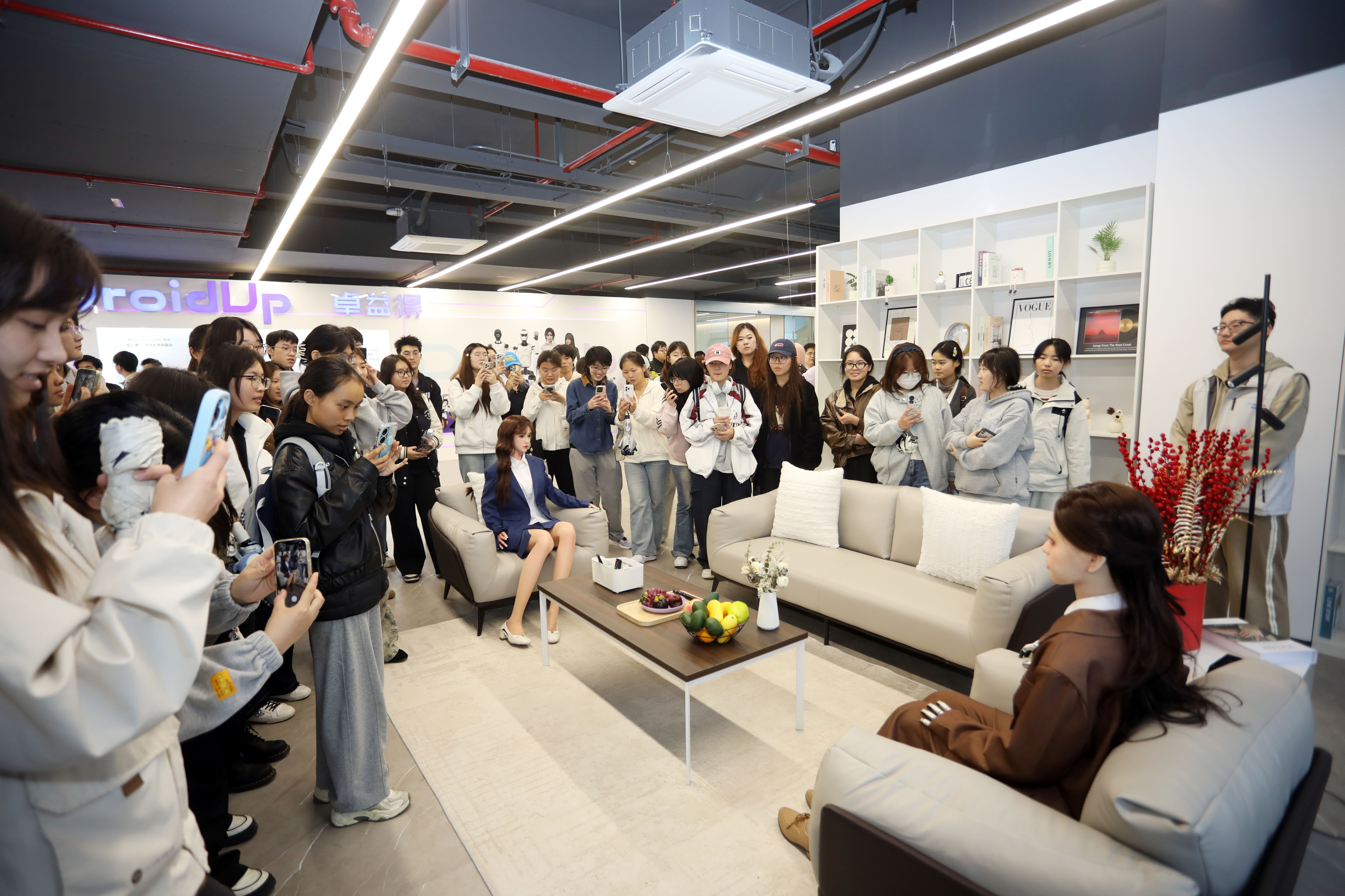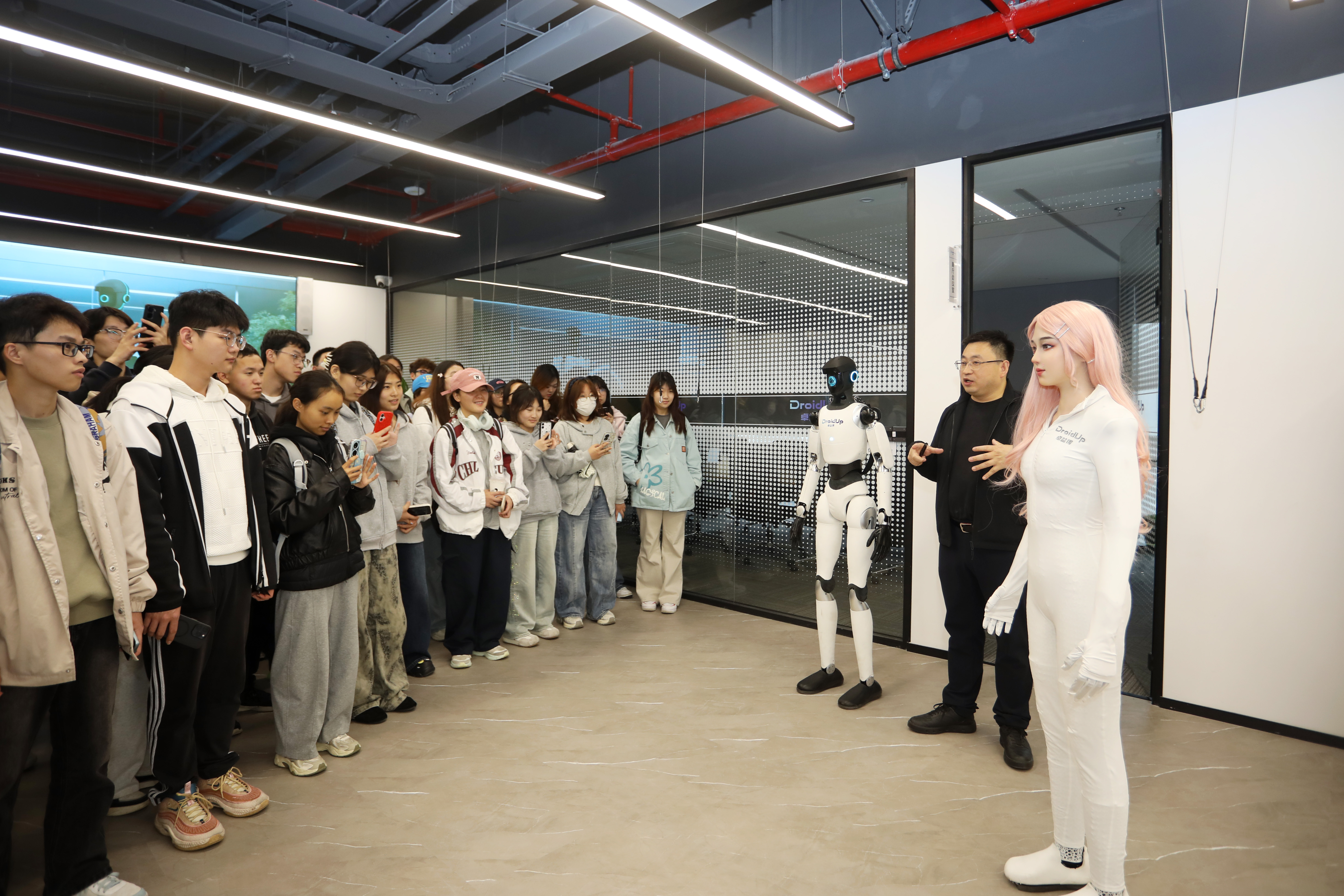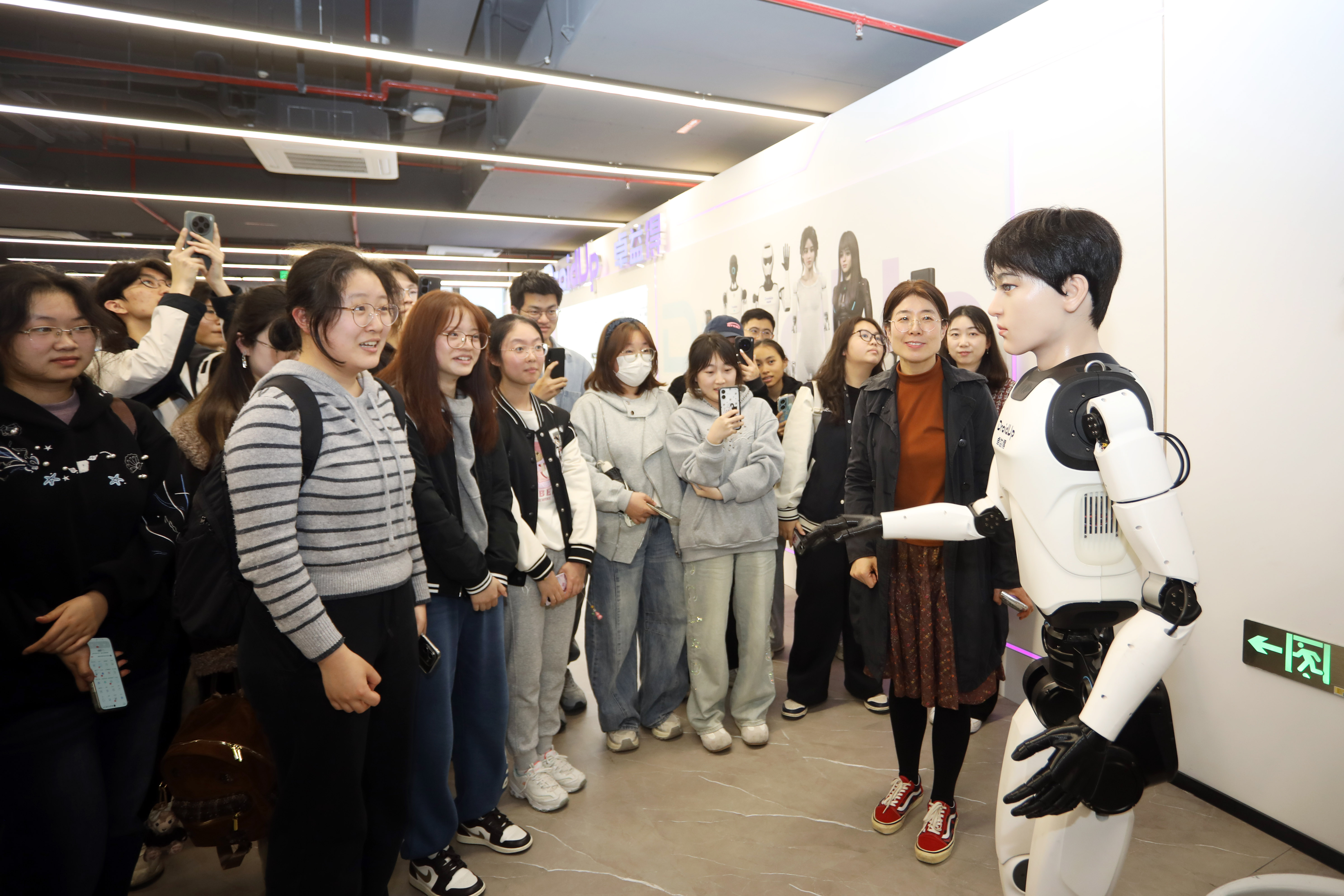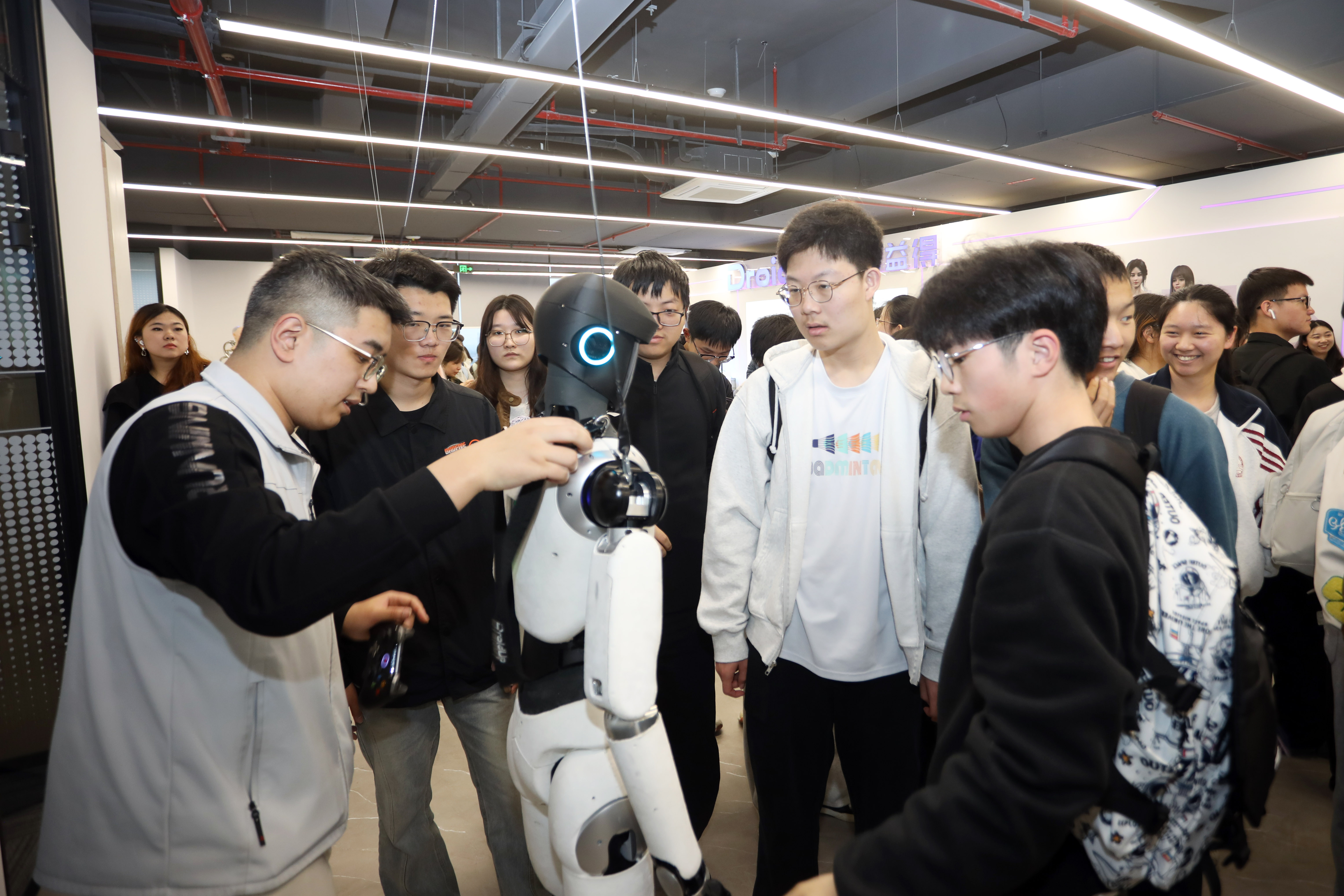 “在这个展厅里,有各式各样的人形机器人,同时也模拟了各种人性机器人运用场景”,李清都向同学们讲解道,“之所以选择做人形机器人,是因为该类机器人的定位就是为人服务,我们希望能够开辟人机共生新赛道。”理论课后,学生们走进企业研发实验室与精密制造车间,分为四个小组展开现场实践学习。