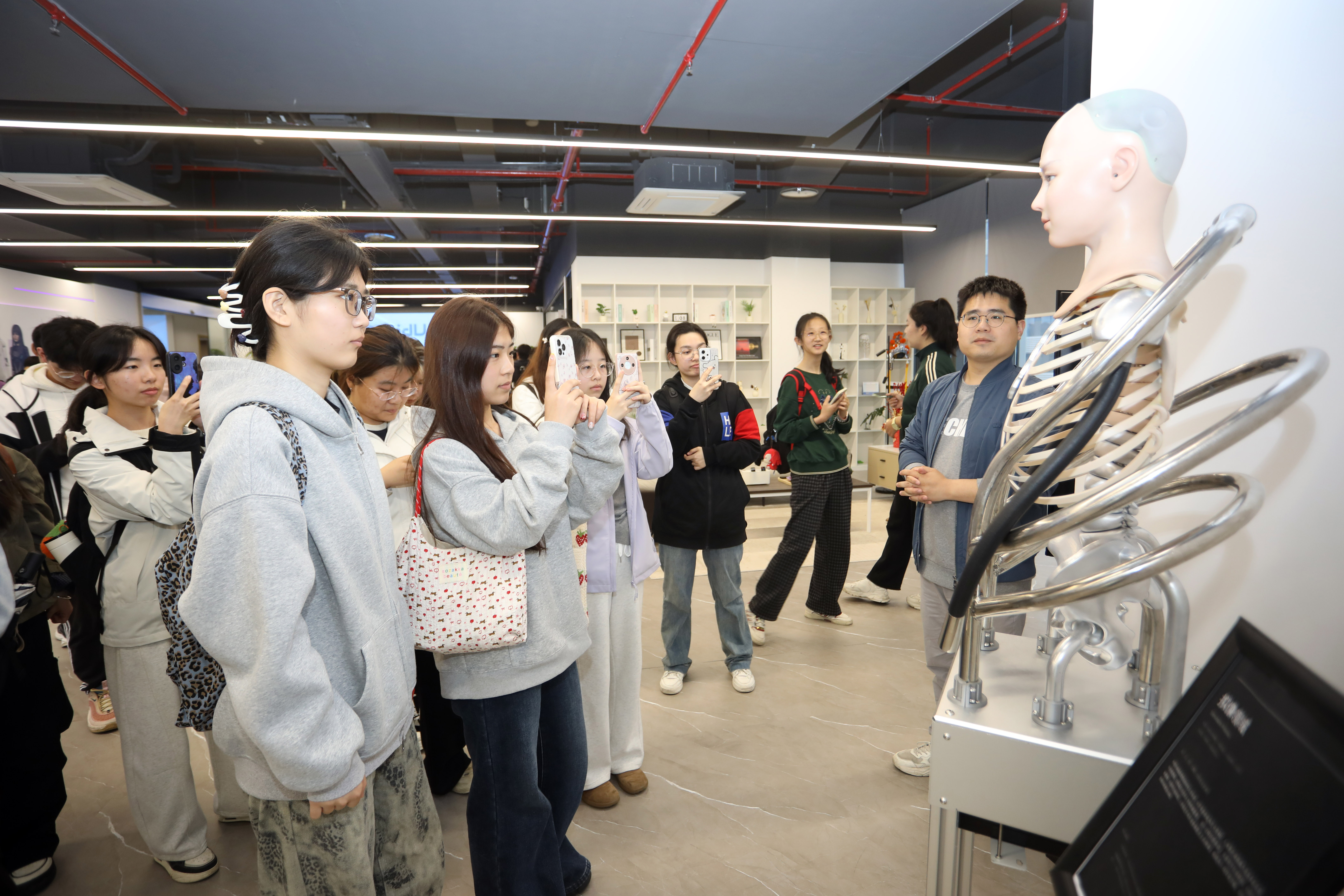 “我是上海戏剧学院戏剧与影视专业的博士学生,‘学霸01’!”四号展区里,机器人“学霸01”正幽默地与同学们畅谈,时而逗得大家大笑。随后,现场工作人员从上至下,逐一讲解了它的五官传感器、肌腱驱动原理等核心技术。“在这堂课上,我亲眼看到工程制造原理如何转化为实实在在的产品,也真切感受到了企业里精益求精、攻坚克难的精神力量。” 基础学部2025级易安馨感慨道,“作为工科智造专业学子,我明白了专业学习不是孤立的,每一次技术突破都与国家发展紧密相连。”