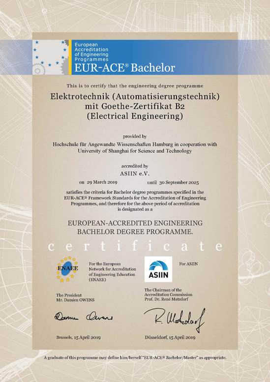 近日,上海理工大学德国合作伙伴汉堡应用技术大学(HAW Hamburg)传来喜讯,上海理工大学中德学院的电气工程技术及其自动化(中德合作)和机械设计制造及自动化(中德合作)两个专业向“欧洲工程教育认证网络协会”(ENAEE)递交的“欧洲工程师证书”(EUR-ACE)申请,于2019年4月15日正式获批,这标志着我校这两个专业的合格本科专业毕业生,可以获得“欧洲工程师”资质,对我校国际化工程教育具有重要意义。 据统计,截至2018年初,ENAEE已授权15家机构授予“EUR-ACE”标签,该标签已授予包括德国、法国、英国、俄罗斯、葡萄牙、土耳其、芬兰等欧洲内外35个国家的约2600个工程学位课程;获得该资质的学生具有在相关国家从事专业有关的工程师工作的资质。
