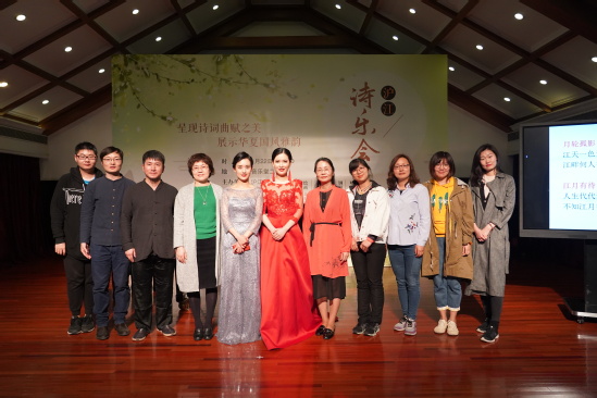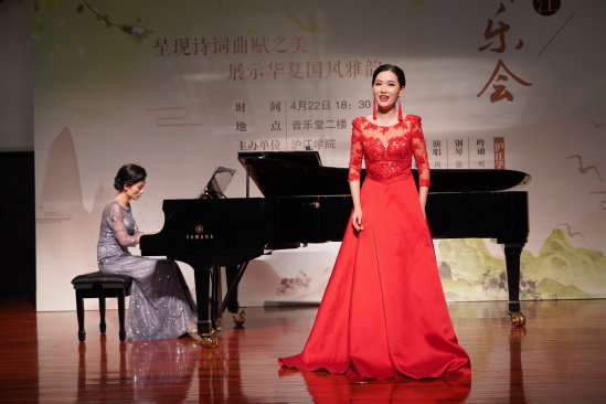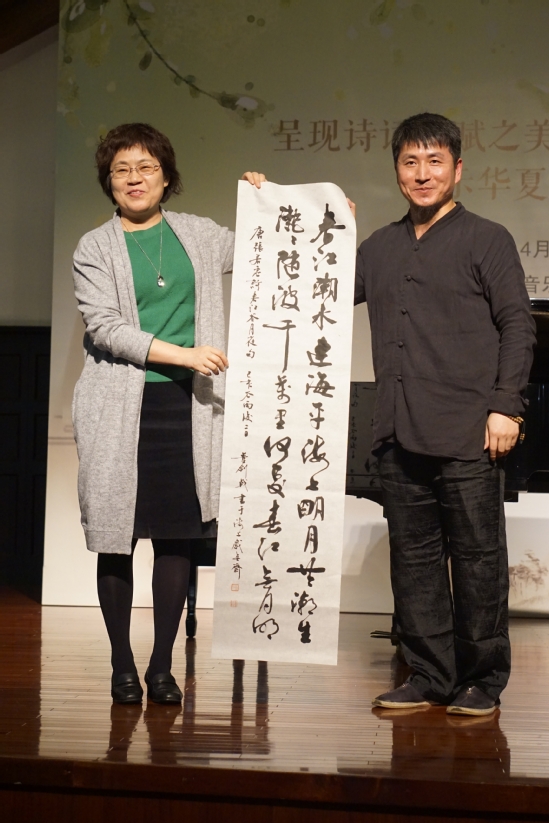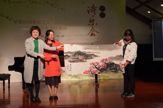 4月22日晚,由沪江学院主办的第一期沪江诗乐会在上海理工大学音乐堂举行。沪江学院刘永、张宇迪、董剑戟三位教师携手青年女高音歌唱家、上海师范大学声乐系周燕燕老师,及上海知名书画家王丽红老师一起,为上海理工大学220余名师生及来自校外的诗词爱好者献上了一场吟诵、钢琴、演唱、书法、绘画五位一体的诗乐盛宴。 本次沪江诗乐会精选了《周南·关雎》、《上邪》、《枫桥夜泊》、《卜算子·我住长江头》和《春江花月夜》等五首古诗词,涵盖了《诗经》、汉乐府、唐诗、宋词等不同的诗歌体裁。刘永老师从中国传统文化的深厚背景出发,对每一首诗词的深刻内涵作了深度解读,并讲解了有关诗词吟诵的基本规则和方法,现场展示了诗词吟诵;周燕燕老师则为大家演唱了这几首古诗词艺术歌曲,通过她的演绎,让大家对诗词所表达的内涵,有了更深刻、更直观的感悟;张宇迪老师从音乐的角度,为大家介绍了艺术歌曲的起源与艺术特点,以及中国艺术歌曲的发展脉络和审美特征。整场诗乐会在对于《春江花月夜》的演绎中达到了高潮。在对这首诗的阐释、吟诵及根据这首诗进行改编的艺术歌曲的演绎中,王丽红老师现场作画,董剑戟老师现场书写,中西五种艺术形式进行了完美结合,听众也在整个过程中获得了对中国古典诗歌的全新的和全面的体验。 诗乐会上,王丽红老师、董剑戟老师还将现场所创作的国画和书法作品馈赠给了沪江学院。沪江学院直属党支部书记、常务副院长陈红接受了馈赠。 最后,陈红作了简短讲话,她说,沪江学院承担着上海理工大学人文素养教育的重任,正在努力建设具有理工科大学特色的人文素养教育体系,不仅要做好课堂上的经典导读和人文通识课程的理论教学工作,同时也着力加强实践和体验式教育,积极整合校内外资源,开发第二课堂,力争让每位同学在大学四年期间都能够现场体验一次中华优秀传统文化的魅力。沪江诗乐会的策划与举办,正是在沪江杯诗词大会、汉服展演与体验等活动获得良好效果之后的又一次积极有益的探索。 整场诗乐会在参会师生热烈的掌声中落下帷幕。