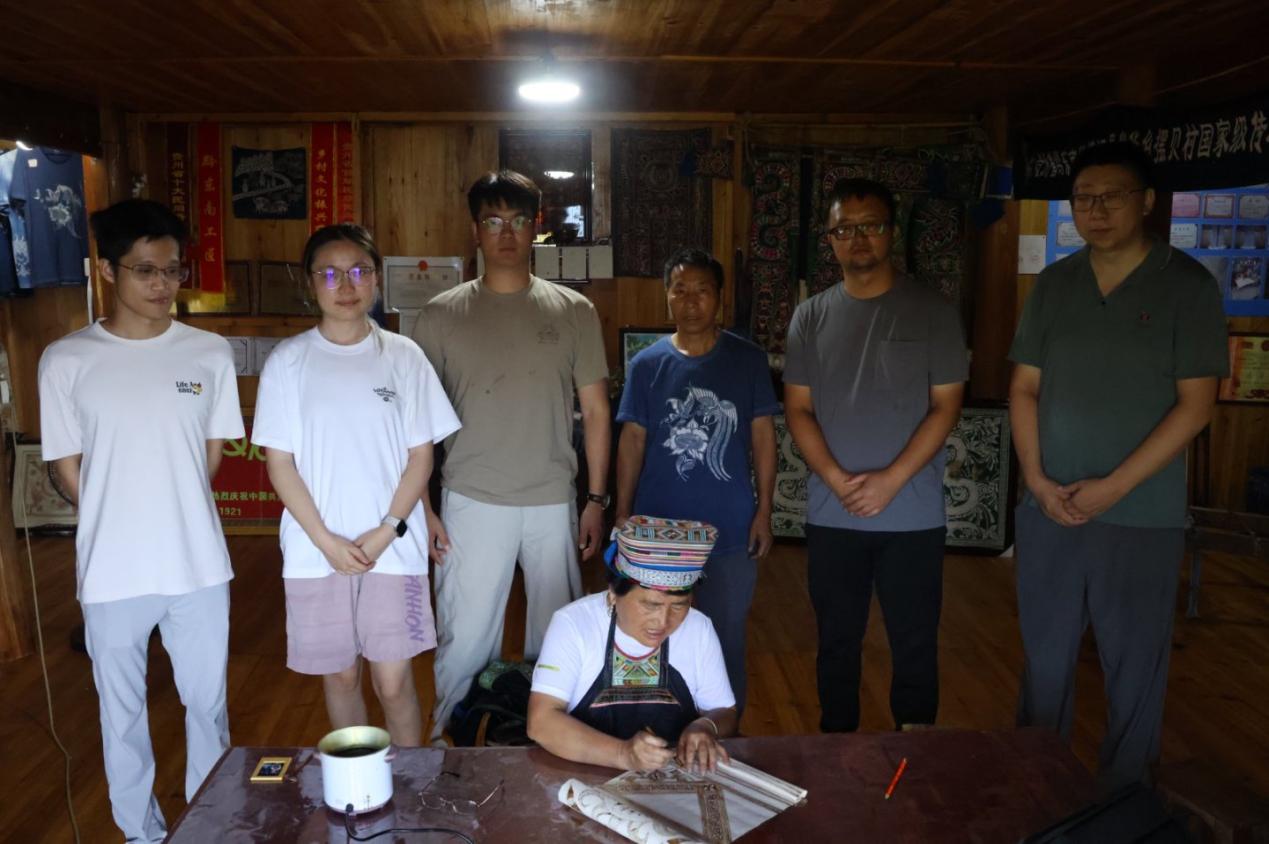 第二站:宁航工坊观新韵,匠心熔铸古今魂 团队走进宁航蜡染公司的现代化工坊,却见传统与创新在此共舞。车间里,标准化染缸排列如蓝釉长阵,自动化脱蜡设备吞吐着布匹,而工作台前,老师傅们仍握着铜刀,指尖的温度透过蜂蜡,在棉布上复刻着千年纹样。“我们守着老手艺,也得让它走得更远”。公司负责人指着展厅里的蜡染时装、文创摆件,“机器能批量生产,却替代不了手艺人对蜡线虚实的把控。你看这朵山茶花,花瓣边缘的蜡要薄如蝉翼,染出来才会有渐变的呼吸感——这是机器学不会的灵魂。”团队成员围坐于手艺人身边,看她铜刀斜挑,蜡液在布上晕开细微的涟漪。“年轻时觉得铜刀沉,现在握着它,就像握着阿妈的手”。老人眼角的皱纹里盛着笑意,“蜡染不是冷的技艺,是热的心跳,每块布都记得你画蜡时的呼吸”。当现代流水线的嗡鸣与铜刀落布的轻响交织,团队成员体会到:所谓匠心,是让千年技艺在时代浪潮里,既守得住根,也开得出花。 蜂蜡上的千年指纹 第三站:苗寨深处访宗师,古蓝底色见源流 晨光漫过吊脚楼的木栏,团队沿着青石板路走进摆贝苗寨,国家级非遗传承人姜老本的家就在寨心的老榕树下。老人正坐在火塘边熬蜡,铜刀悬在炉上,蜂蜡融化的香气混着柴火的暖,漫出木窗,与寨子里晾晒的蜡染布相映成趣。“我们苗家人的蜡染,是从崖画上走下来的”。姜老师铺开一块祖传蜡染,描绘着纹样里苗寨迁徙的路线,随后她带众人前往参观寨中老染缸,缸沿的木纹里还嵌着上世纪的蜡屑。“我爷爷用它染过战袍,我爸爸用它染过嫁妆,现在我教娃娃们染,这缸子就还是活的”。在传承人的指导下,团队成员们亲身体验了蜡染的制作过程。大家学着用古法画蜡,铜刀不听使唤,蜡线歪歪扭扭。姜老师笑着说道:“这手艺不能急,像苗歌一样,要慢慢唱,慢慢画,心定了,蓝也深了”。夕阳落在蜡染布上,靛蓝底色里,仿佛看见千年时光在流转。从深山苗寨到现代工坊,从铜刀画蜡到薪火相传,这抹蓝,原是黔地儿女写给岁月的长诗。 授艺学习 沪黔相隔千里,却因这抹靛蓝紧紧相连。上理“靛行者”团队的研学之路,既是对千年技艺的溯源,更是对传承二字的注解:当年轻的目光与古老的蜡染相遇,当创新的思维触碰坚守的匠心,这抹穿越时光的蓝,必将在更多人手中,染出更绵长的未来。