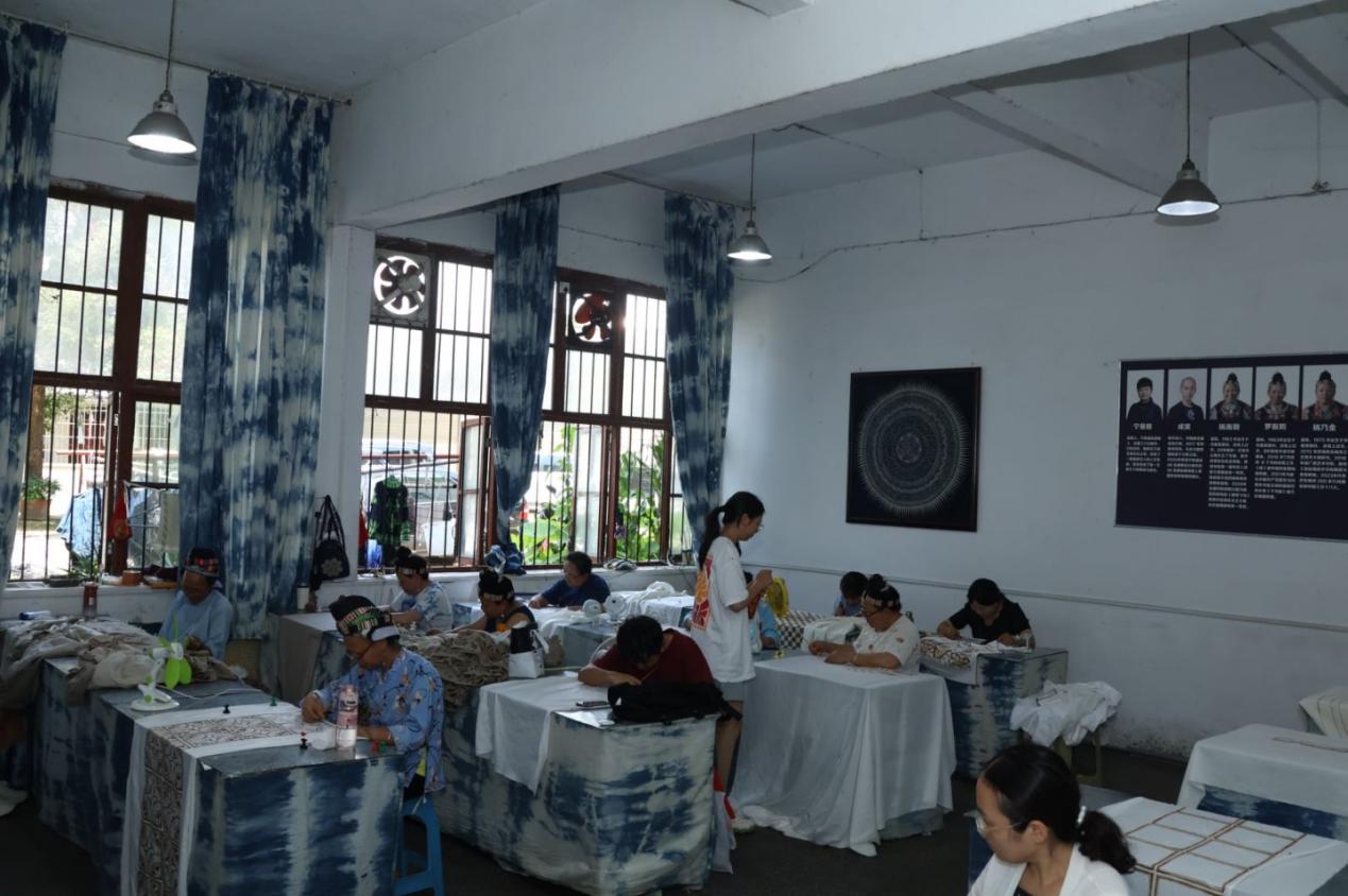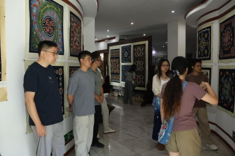 七月下旬,环建学院李飞鹏老师、康诗飞老师、王翀老师带领我校“靛行者”社会实践团队踏上前往贵州的征程,开启了一场以“研学薪传千年蜡染技艺”为主题的实践之旅。此次活动旨在通过深入了解国家级非物质文化遗产——贵州蜡染,感受其深厚的文化底蕴,同时为这一古老技艺的传承与发展贡献青年力量。 贵州蜡染,作为中国民间传统纺织印染手工艺的瑰宝,有着数千年的历史。它以素雅的色调、精美的图案和丰富的文化内涵闻名于世,是贵州各民族智慧的结晶。“靛行者”团队的同学们对这一古老技艺充满了好奇与向往,带着探索与学习的热情,他们走进了贵州的蜡染之乡。 第一站:福远馆藏识苗纹,靛蓝初染时光痕 黔地晨雾未散,上理“靛行者”团队已踏入福远博物馆的朱门。馆内木架上,数百件苗族蜡染珍品如凝固的星河——老布上的蝴蝶妈妈纹舒展翅翼,铜鼓纹沉淀着先民的叩拜,鱼鸟纹在靛蓝底色里游弋,仿佛能听见苗寨古歌里的生命回响。讲解员指尖划过一块百年蜡染背扇,“苗族姑娘从学步起,就跟着阿妈认这些纹样。蝴蝶是始祖,牛角是力量,每一针蜡迹都是写给天地的信”。团队成员屏息细看:蜂蜡在棉布上凝成的线条,或如悬崖藤蔓苍劲,或似溪涧流水柔婉,经靛蓝浸染、沸水脱蜡后,白纹与蓝底交相辉映,像把日月星辰裁进了布匹。作坊里,手艺人正演示蜡染流程:铜刀蘸蜡如握笔,在布上疾走如飞;浸缸里的蓝靛草汁液泛着幽幽光,是山野草木酝酿数月的馈赠;脱蜡时蒸腾的热气中,纹样骤然清晰,引得众人轻呼。“原来一块蜡染,要经画蜡、染色、脱蜡、晾晒十数道工序,耗去半月时光”。团队成员在笔记上写下:蜡是骨,蓝是魂,苗家人把岁月熬成了这抹靛蓝。
