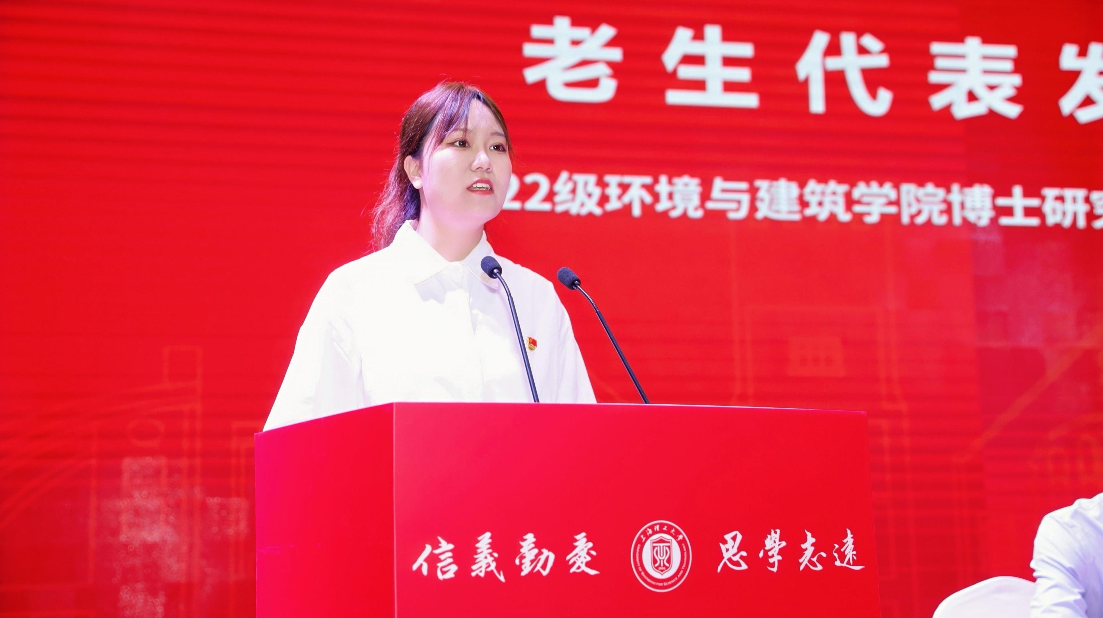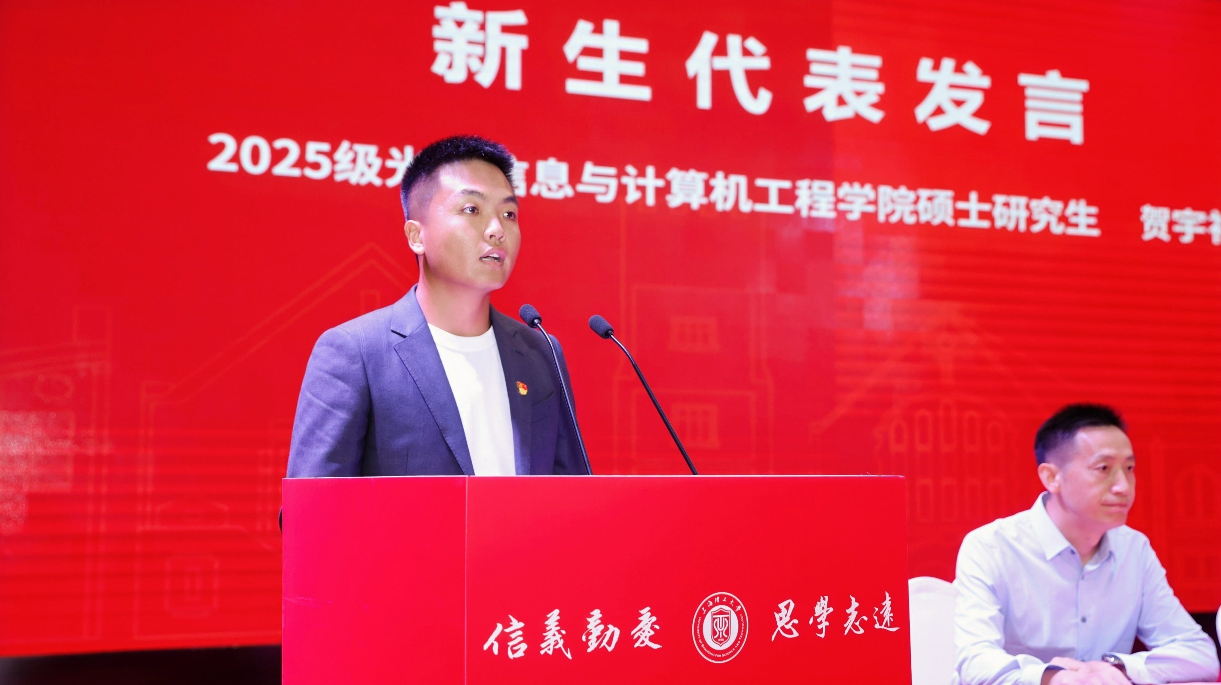 新生代表贺宇祥发言 老生代表龙宇琼发言 导师代表张启明发言 作为2025级研究生新生代表,来自光电信息与计算机工程学院的硕士研究生新生贺宇祥结合自己参军报国的经历,阐述个人成长与国家发展的紧密联系,提出青年学子应以科技为矛、以智慧为甲,以实际行动践行报国为民的时代使命。环境与建筑学院2022级能源与环境工程专业博士研究生龙宇琼作为老生代表发言,她分享自己的科研与成长体会的同时建议新生主动拓展学科边界,注重理论研究与现实应用的结合,在服务国家战略中实现学术价值,并珍视科研旅程中的合作情谊与日常收获。智能科技学院导师代表张启明教授在发言中向新生提出科研建议,强调要建立系统思维和跨界融合能力,理性面对科研中的“非理想”现实,通过持续迭代提升问题解决能力,并将个人研究方向与国家重大战略需求有机衔接。