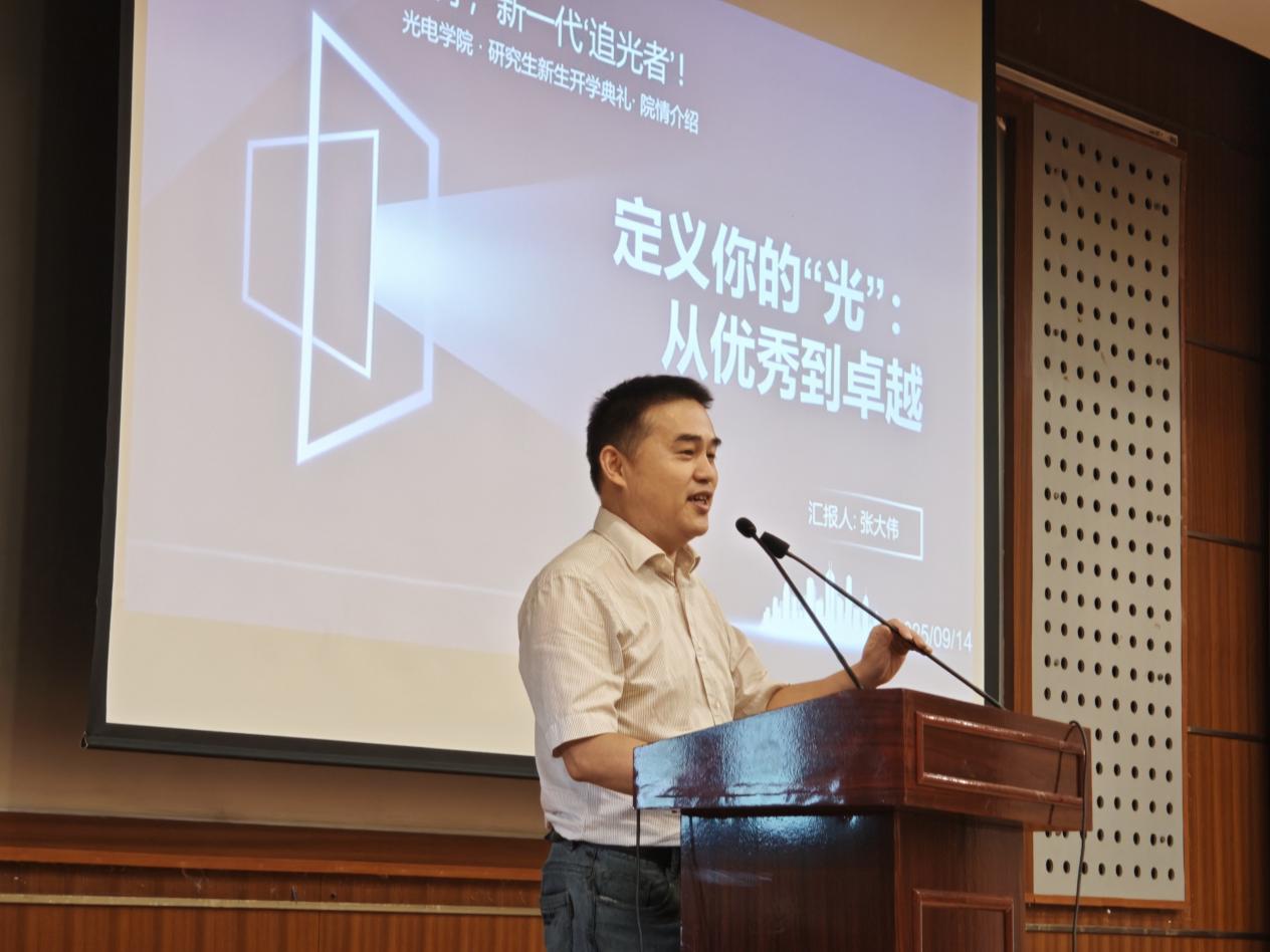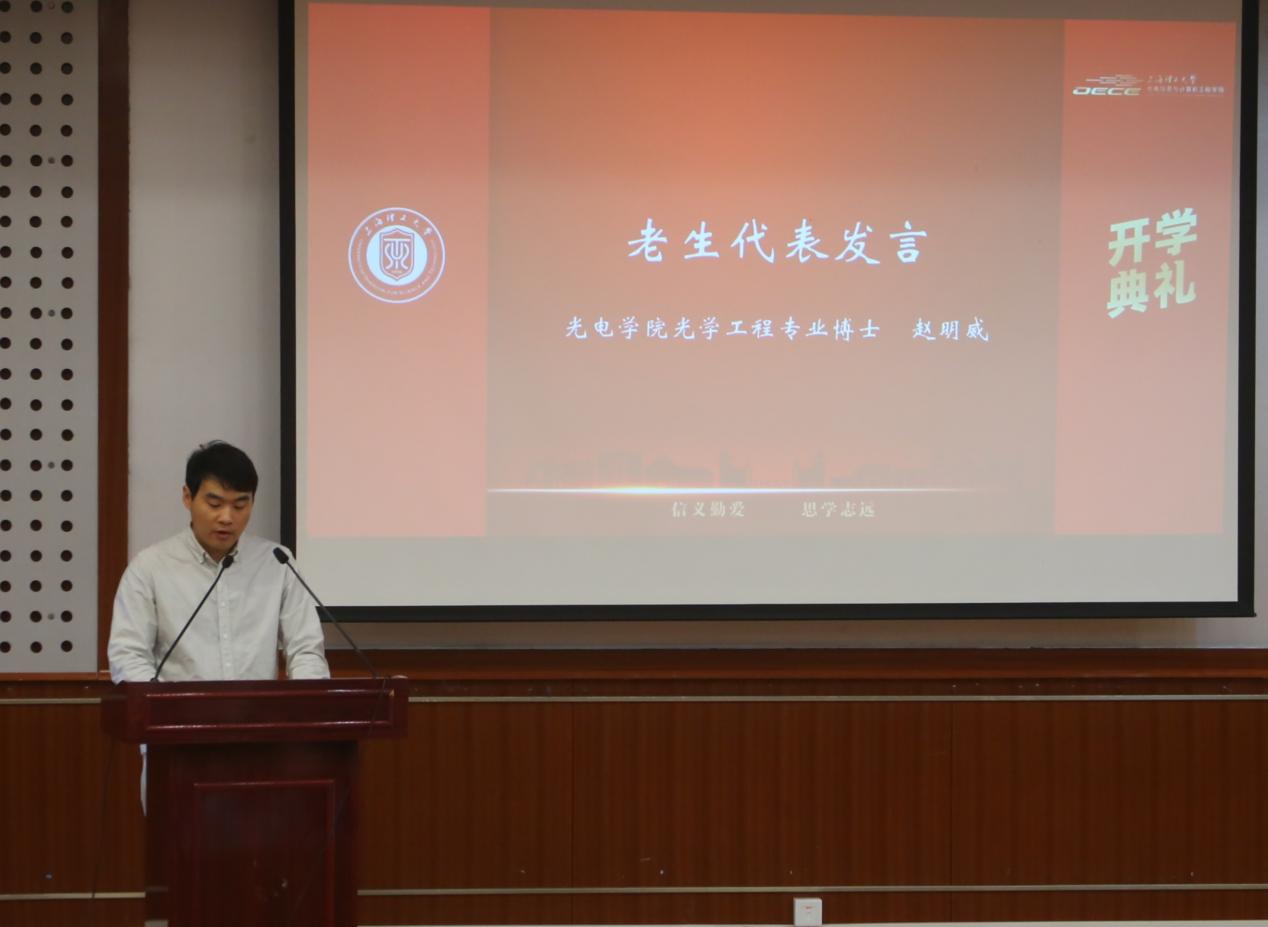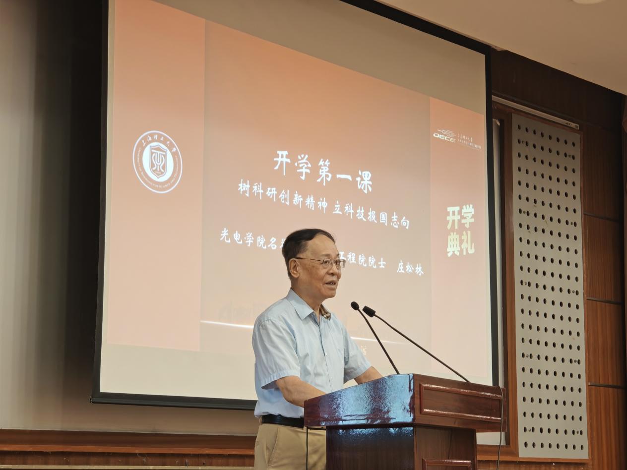光电信息工程系教师金钻明作为导师代表发言。他从“研究者素养养成”的视角,对新生提出期望。他指出,研究生阶段的核心是从知识接受者转变为知识创造者,鼓励同学们主动融入科研环境,充分利用学院先进的实验平台与学术资源。他强调,跨学科视野与团队协作能力至关重要,应在交流合作中激发思维、实现创新突破。 老生代表发言 光学工程专业博士生赵明威作为老生代表,分享了科研与生活平衡的经验。他坦言,博士生阶段不仅考验智慧,更磨炼心志和体魄,自己通过坚持长跑和羽毛球等锻炼,不仅有效强化了体能,也显著提升了专注力和抗压能力。他建议新生合理规划时间、保持规律作息,促进科研与健康协同发展。 院情介绍 学院院长、党委副书记张大伟以“光电新时代,奋斗正当时”为题,向同学们介绍了学院发展近况与未来规划,并分享近期学科建设与科研创新方面取得的系列突破。站在新起点上,他向新生提出三点期望:勇于探索未知,突破学科边界;保持国际视野,追踪科技前沿;持续超越自我,实现多元成长。他勉励大家既要“追逐光”,更要“成为光”,以实际行动为国家光电事业贡献青春力量。 院士讲授开学第一课 中国工程院院士、学院名誉院长庄松林以“最美的科研誓言就是爱党爱国”为题,为新生讲授《开学第一课》。他回顾了自己从艰苦求学至海外归国的科研历程,分享了对科学事业的热爱与对祖国的深厚情感。庄院士感慨道,“再困难的时期,我都没有停止读书和思考”。他鼓励打破单一学科局限,主动从人类文明中汲取营养,培养跨界思维方式,融合科学精神与人文情怀,以拓宽科研道路。他勉励光电学子既要脚踏实地夯实基础,更要志存高远、抬头看路,以开放心态迎接挑战,以坚韧意志和使命成就梦想。