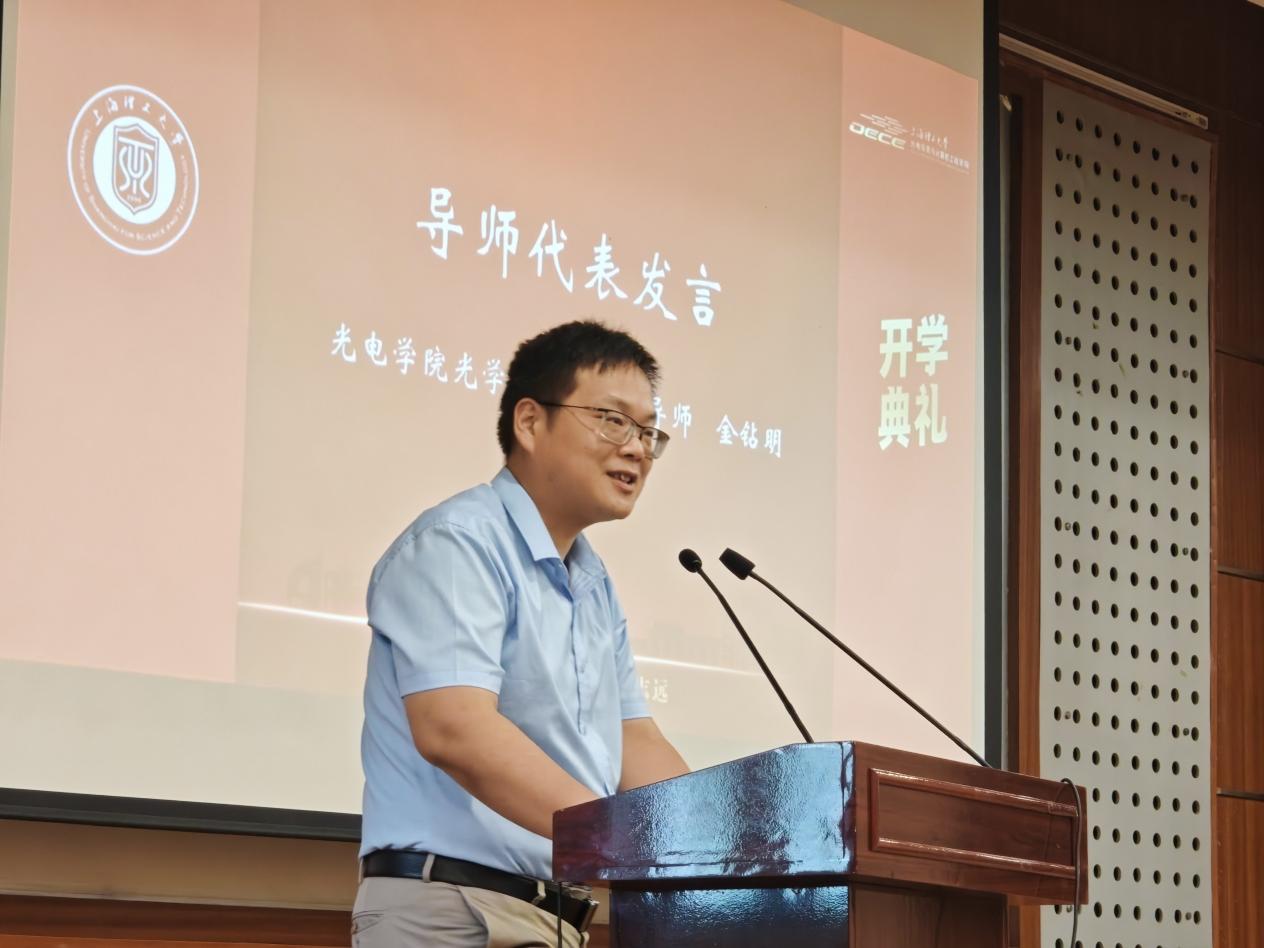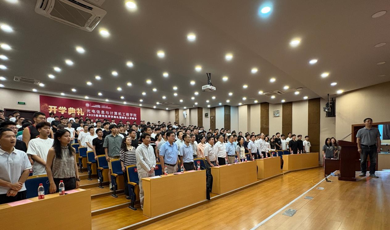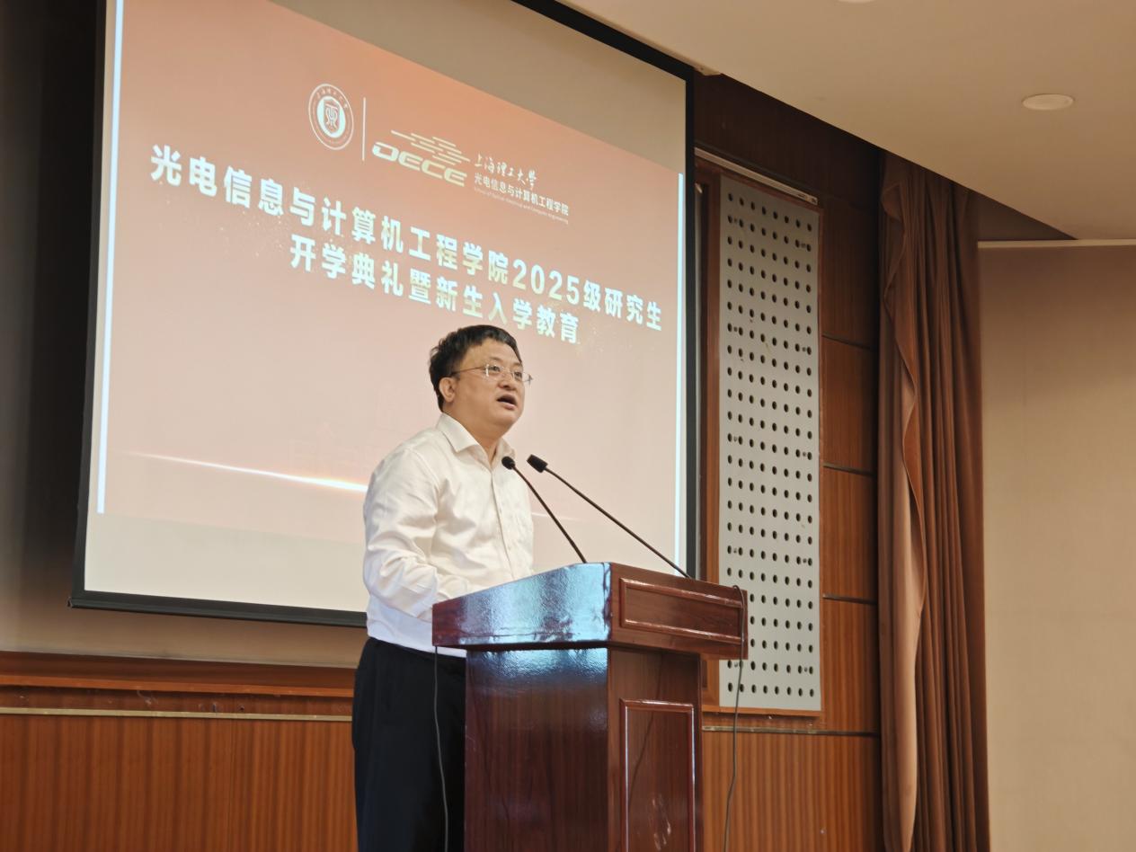 光电信息工程系教师金钻明作为导师代表发言。他从“研究者素养养成”的视角,对新生提出期望。他指出,研究生阶段的核心是从知识接受者转变为知识创造者,鼓励同学们主动融入科研环境,充分利用学院先进的实验平台与学术资源。他强调,跨学科视野与团队协作能力至关重要,应在交流合作中激发思维、实现创新突破。 老生代表发言 光学工程专业博士生赵明威作为老生代表,分享了科研与生活平衡的经验。他坦言,博士生阶段不仅考验智慧,更磨炼心志和体魄,自己通过坚持长跑和羽毛球等锻炼,不仅有效强化了体能,也显著提升了专注力和抗压能力。他建议新生合理规划时间、保持规律作息,促进科研与健康协同发展。 院情介绍 学院院长、党委副书记张大伟以“光电新时代,奋斗正当时”为题,向同学们介绍了学院发展近况与未来规划,并分享近期学科建设与科研创新方面取得的系列突破。站在新起点上,他向新生提出三点期望:勇于探索未知,突破学科边界;保持国际视野,追踪科技前沿;持续超越自我,实现多元成长。他勉励大家既要“追逐光”,更要“成为光”,以实际行动为国家光电事业贡献青春力量。 院士讲授开学第一课 中国工程院院士、学院名誉院长庄松林以“最美的科研誓言就是爱党爱国”为题,为新生讲授《开学第一课》。他回顾了自己从艰苦求学至海外归国的科研历程,分享了对科学事业的热爱与对祖国的深厚情感。庄院士感慨道,“再困难的时期,我都没有停止读书和思考”。他鼓励打破单一学科局限,主动从人类文明中汲取营养,培养跨界思维方式,融合科学精神与人文情怀,以拓宽科研道路。他勉励光电学子既要脚踏实地夯实基础,更要志存高远、抬头看路,以开放心态迎接挑战,以坚韧意志和使命成就梦想。