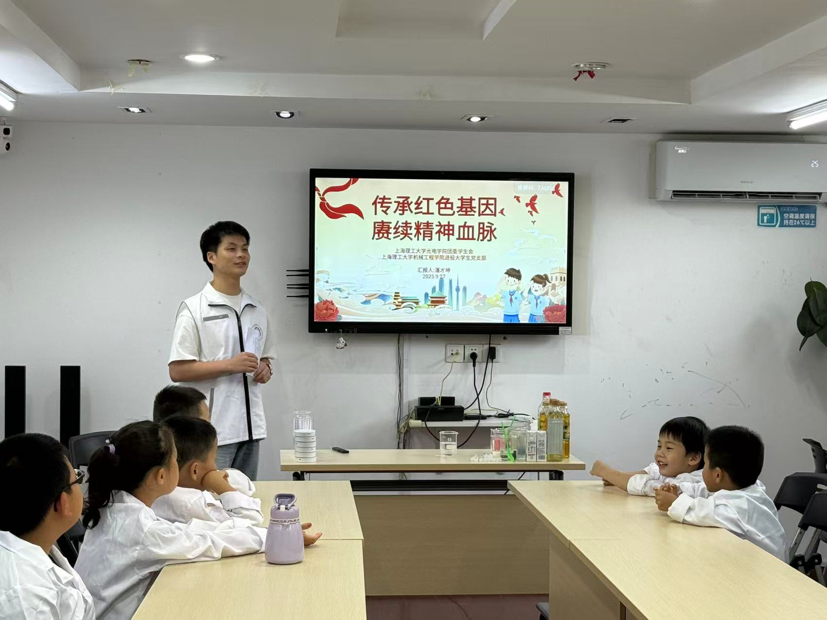 聚焦红色故事,传承红色血脉 9月27日,上理工机械学院退役大学生党支部联合光电学院团委学生在江浦路街道大连路睦邻中心以“传承红色基因,赓续精神血脉”为主题,为社区小朋友带来了一场生动的“红色故事课堂”,引导小朋友们在红色故事中感悟初心,厚植爱国情怀。 支部党员潘才坤用小朋友们喜闻乐见的语言,缓缓展开红色故事的画卷。他通过讲述抗日小英雄从机智传递情报、不惧敌人威胁的 “小交通员”,到为保护战友、勇敢引开敌军的 “小侦查员”的事迹,分享革命烈士刘胡兰面对敌人的铡刀毫不畏惧、坚守信仰直至牺牲的英勇事迹。聚焦一个个鲜活的人物、一段段惊心动魄的经历,让现场小朋友们听得聚精会神,引导小朋友们思考“什么是勇气”“什么是信仰”“什么是爱国”,让红色精神在孩子们心中种下萌芽的种子。