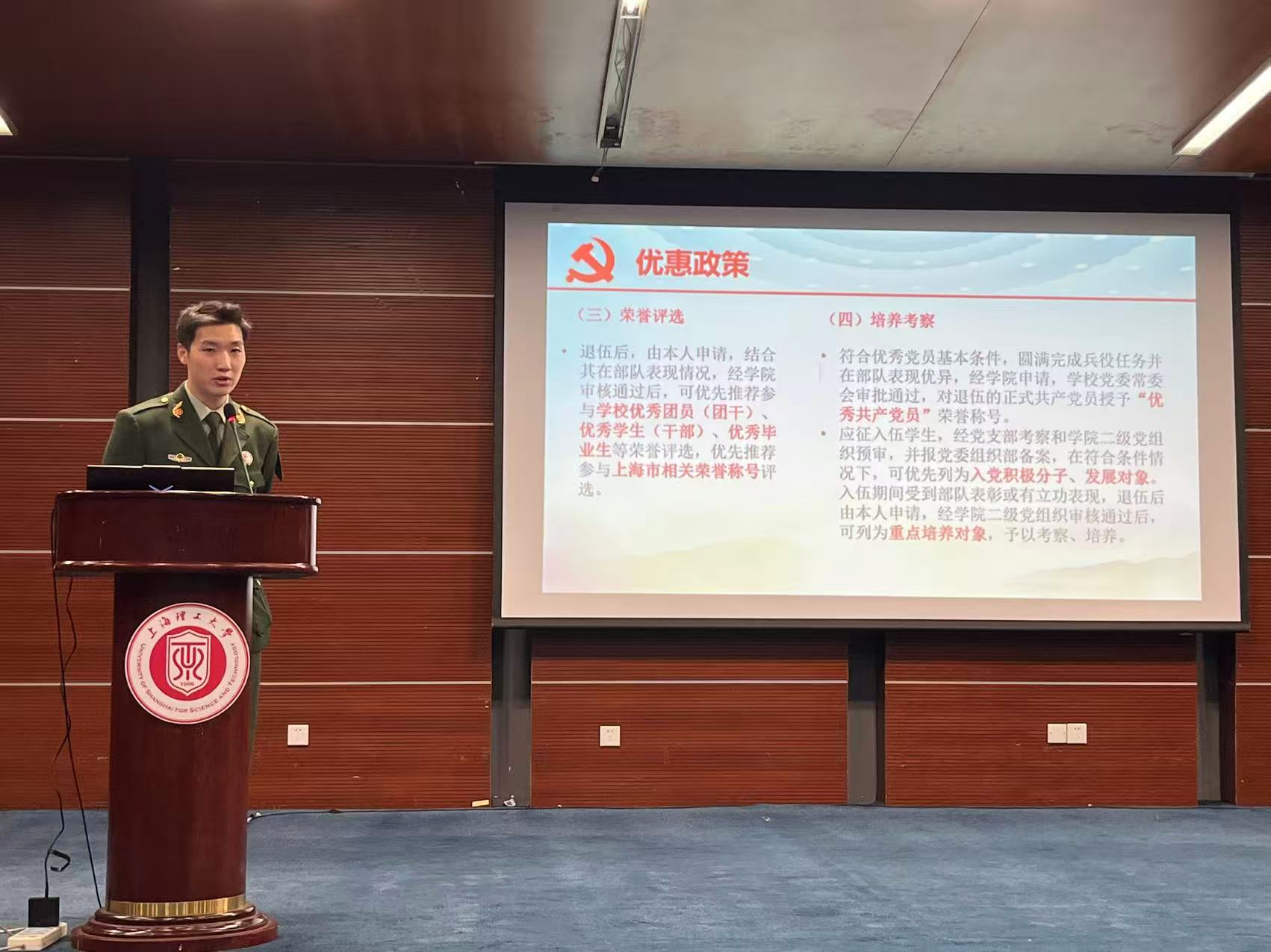 为充分发挥退役大学生在爱国主义教育和国防教育上的优势、激发新时代大学生参军报国热情,开学以来,机械工程学院退役大学生党支部开展“青春戎光·爱我国防”系列主题活动,引导青少年将爱国情、强国志、报国行融入生活、践于行动。 聚焦国防教育,厚植报国之志 9月17日,机械工程学院在营口路校区召开2025级研究生新生入学教育,来自退役大学生党支部的宋学业以“信念”“担当”“使命”为关键词开展“青春戎光·我的军旅生涯”分享。宋学业结合自身军旅生涯与研究生学习经历,从参军意义、军旅生活对个人意志与能力的锤炼、参军如何平衡学业进度以及退伍后科研衔接等内容进行分享。宋学业的分享内容贴近学生需求,既有政策解读,又有情感共鸣,让更多学生了解到参军不仅是履行国防义务的方式,更是实现个人成长、贡献国家力量的重要途径。 9月25日,机械工程学院2024级本科生年级大会在图文报告厅召开。退役大学生党支部马云飞为学院全体2024级学生开展我的军旅生涯之征兵宣讲。马云飞重点从军旅生活对个人纪律意识、团队协作能力的提升、退伍后学业规划、就业选择优势、征兵的基本条件和征兵政策的最新变化等方面进行分享。分享中,马云飞通过讲述自己在部队的难忘经历,让同学们更直观地感受到军人的责任与担当,现场氛围热烈,有效激发同学们的参军报国热情,为学院后续征兵工作的开展奠定了良好基础。