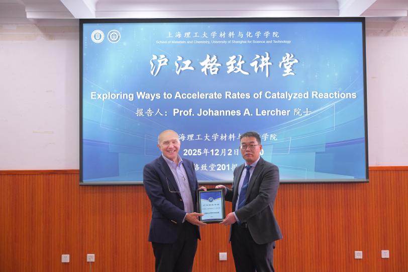 12月2日,材料与化学学院举办“沪江格致讲堂”专题学术报告会,特邀催化领域国际著名学者、奥地利科学院院士、美国工程院院士、欧洲科学院院士、慕尼黑工业大学教授Johannes Lercher,作题为“催化反应速率提升途径探究”(Exploring Ways to Accelerate Rates of Catalyzed Reactions)的学术报告。校党委副书记、纪委书记赵宁出席活动,并为Lercher教授颁发纪念证书。材料与化学学院领导班子成员及百余名师生代表共同参与本次学术盛会。